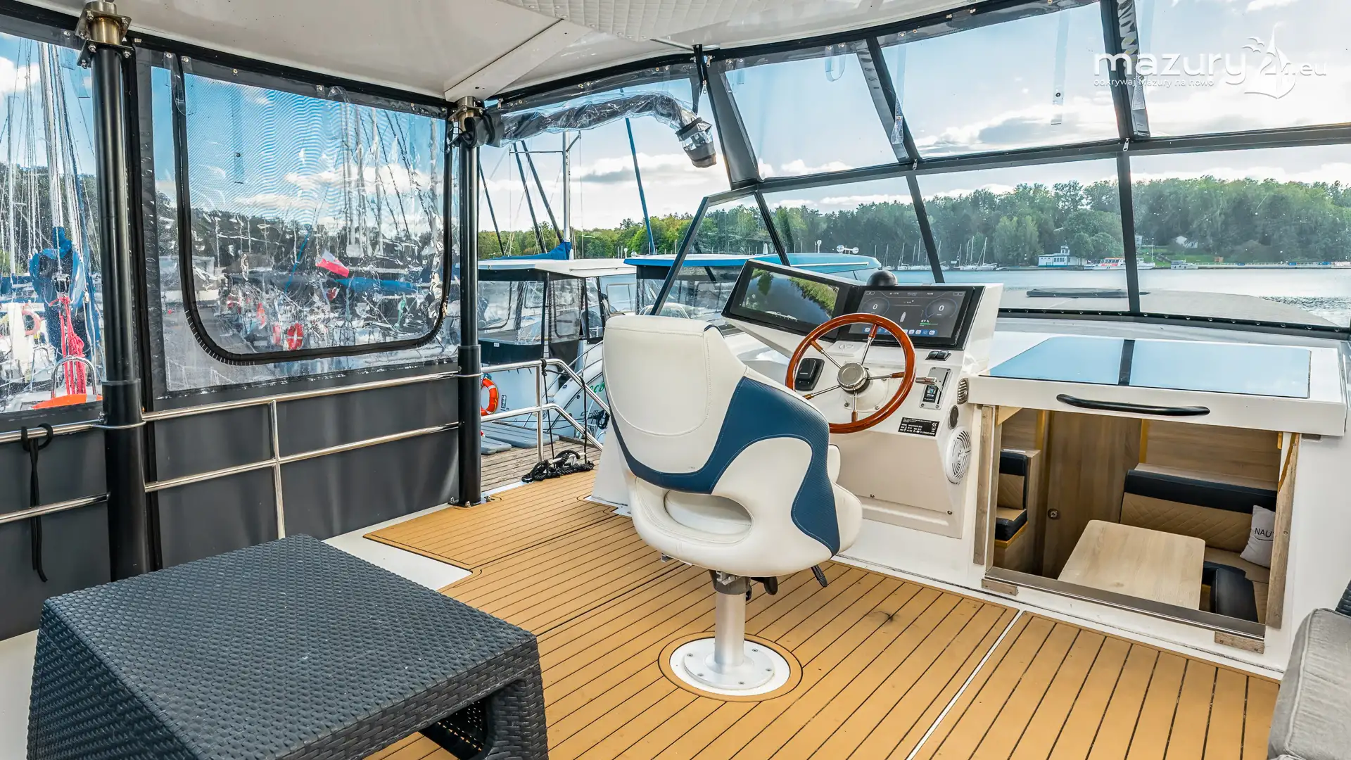 W zależności od konfiguracji jednostka oferuje dwie lub trzy zamykane kabiny dwuosobowe, przestronną mesę z aneksem kuchennym oraz jedną lub dwie łazienki z pełnowymiarowym węzłem sanitarnym. Duże przeszklenia poprawiają doświetlenie wnętrza i wzmacniają wrażenie otwartej przestrzeni. Górny pokład (flybridge) stanowi dodatkową strefę wypoczynku i punkt widokowy, który w warunkach mazurskich czy śródlądowych znacząco podnosi atrakcyjność jednostki.