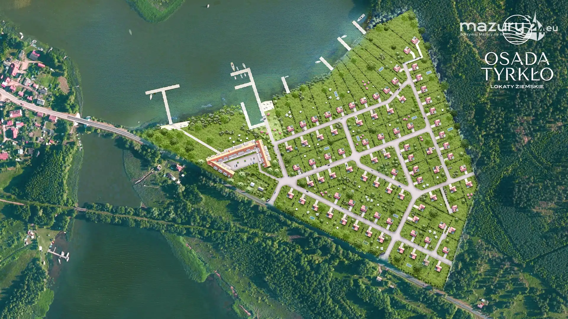 Inwestor zarządzający osadą sprzedaje działki budowlane pod zabudowę całoroczną (średnio jedna działka ma powierzchnię 2000 m2) nad jeziorem Tyrkło niedaleko Orzysza. Planowana jest również budowa obiektu hotelowego.