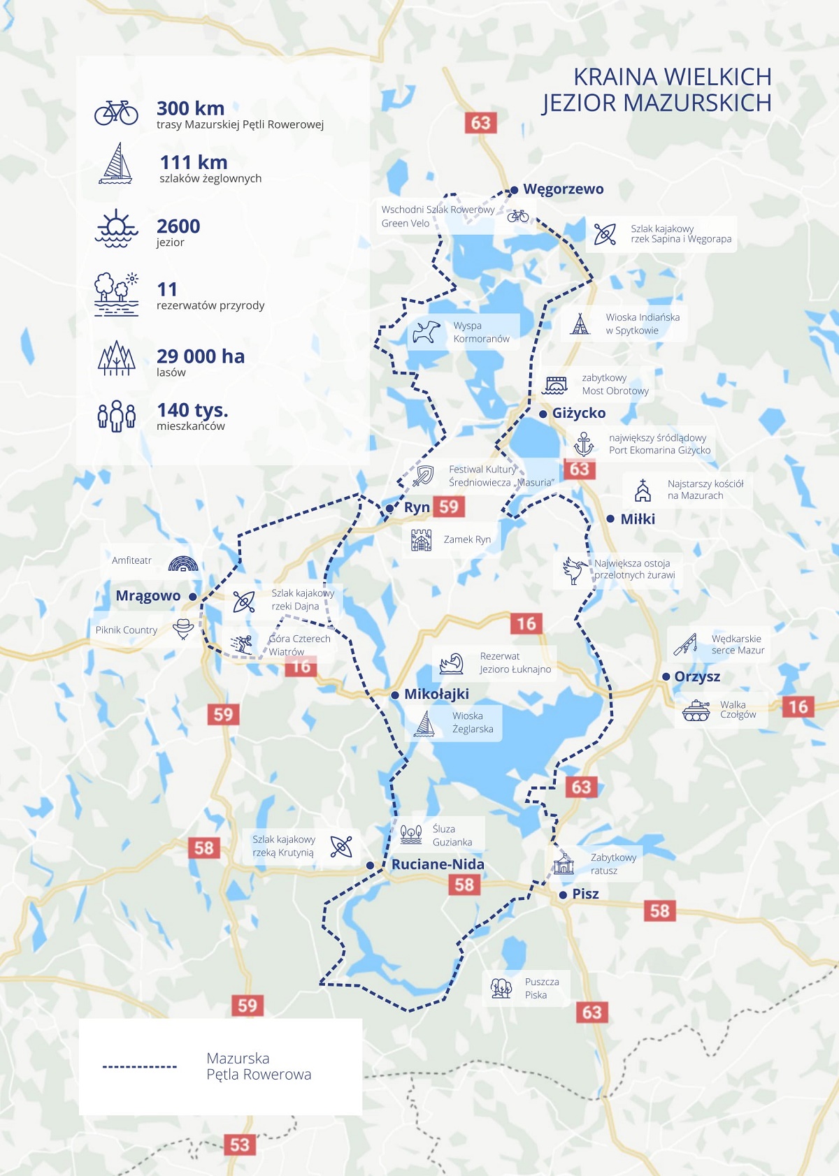 Inną dobrą wiadomością dotyczącą tego unikatowego produktu turystycznego są podpisane 2 kwietnia 2021 r. prze Generalną Dyrekcję Dróg Krajowych i Autostrad w Olsztynie pięciu umów polegających na budowie wydzielonych ścieżek rowerowych przy drodze krajowej nr 63 (w Maldaninie oraz Jeglinie).