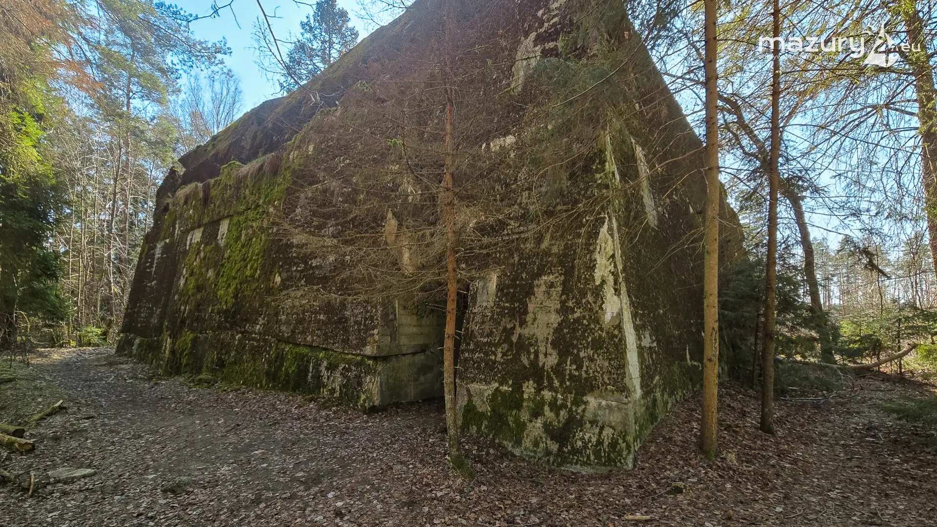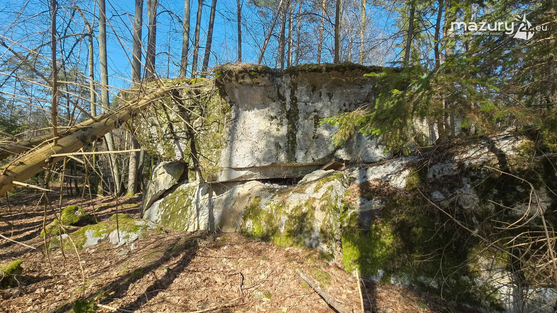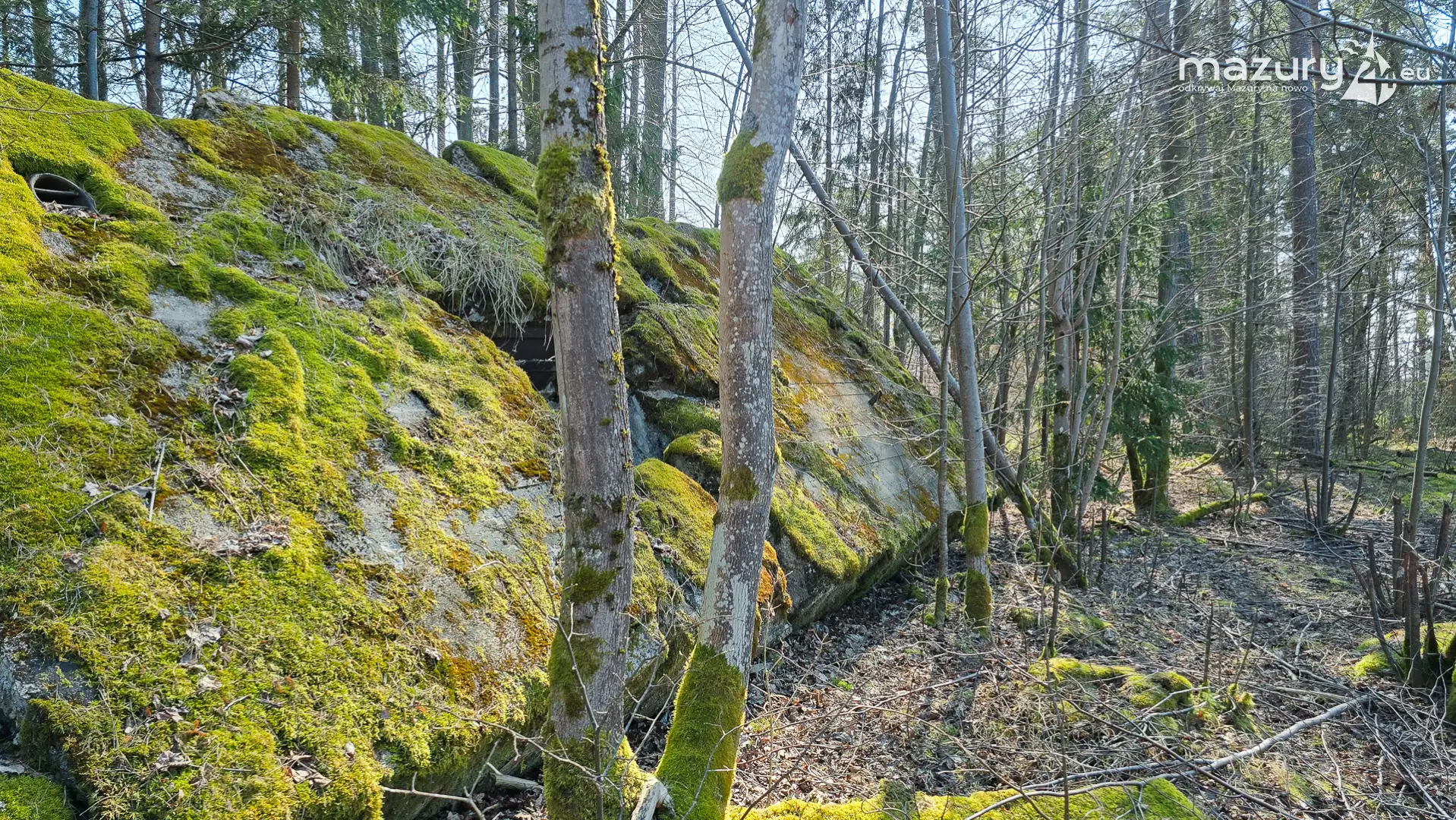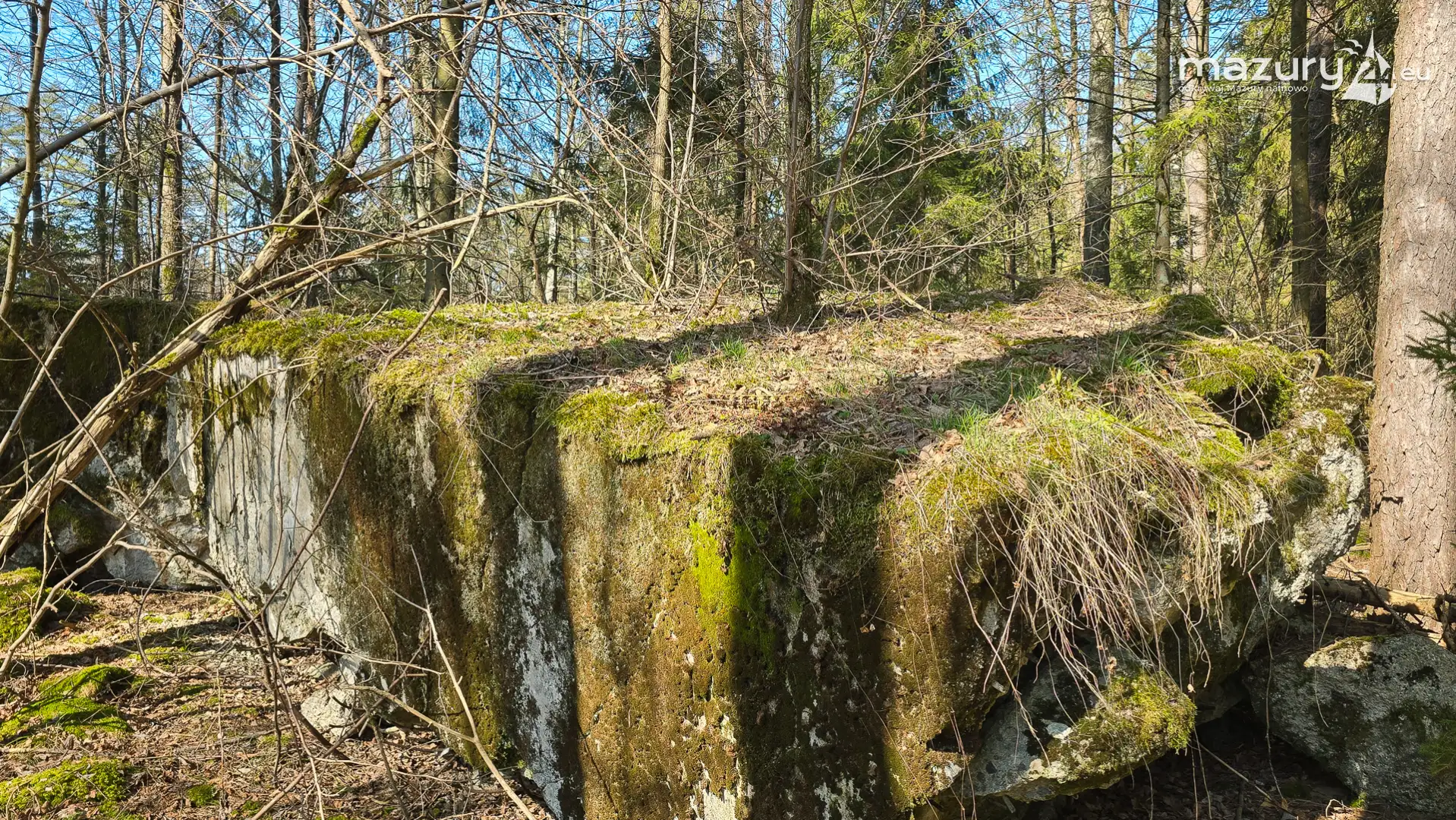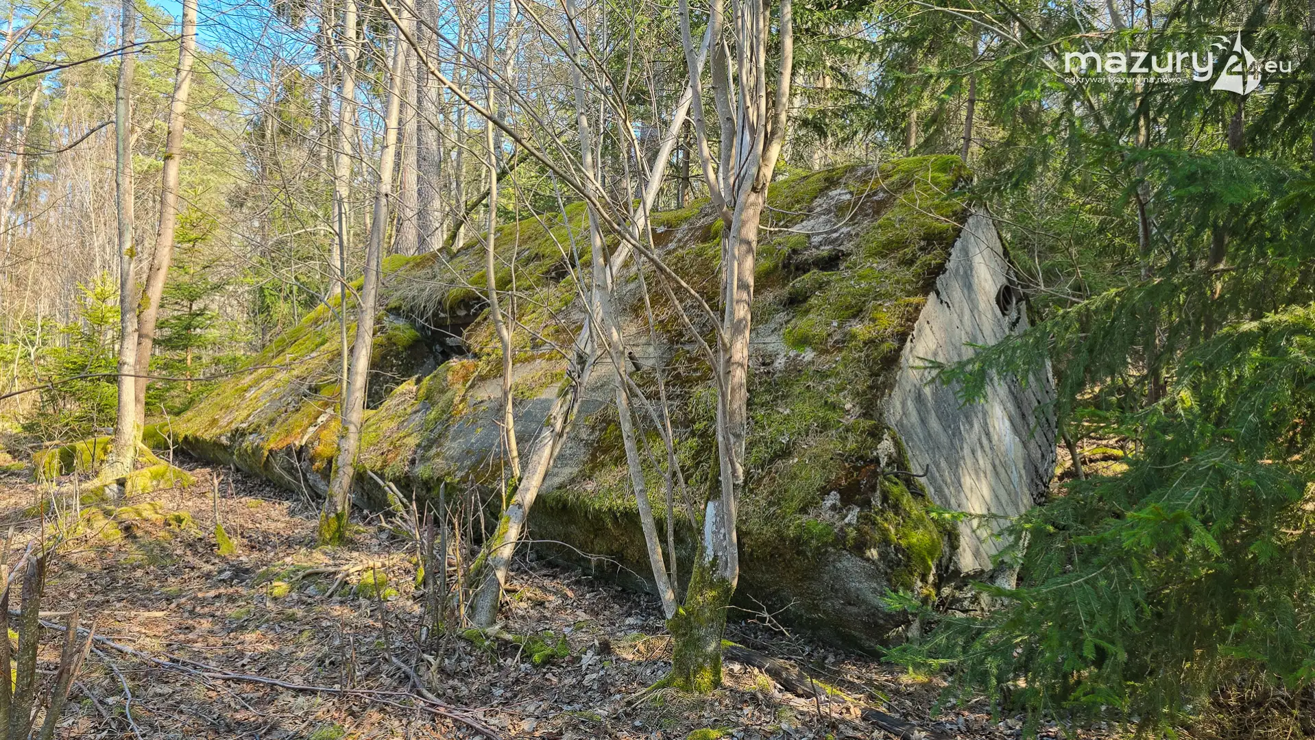 Wczesnowiosenna sceneria odsłania Hochwald w zupełnie innym świetle – brak liści i roślinności pozwala dostrzec więcej detali ukrytych na co dzień w lesie. Ruiny kwatery Heinricha Himmlera w Pozezdrzu, wysadzone w 1945 roku, ukazują dziś potęgę żelbetowych konstrukcji i skalę całego kompleksu. To moment, gdy historia staje się bardziej czytelna – odsłonięte bryły bunkrów wyraźnie rysują dawny układ tej tajnej instalacji.