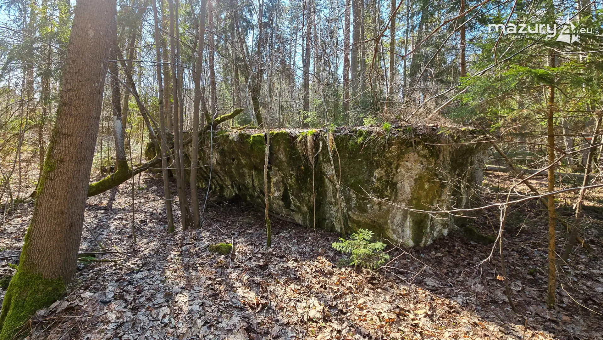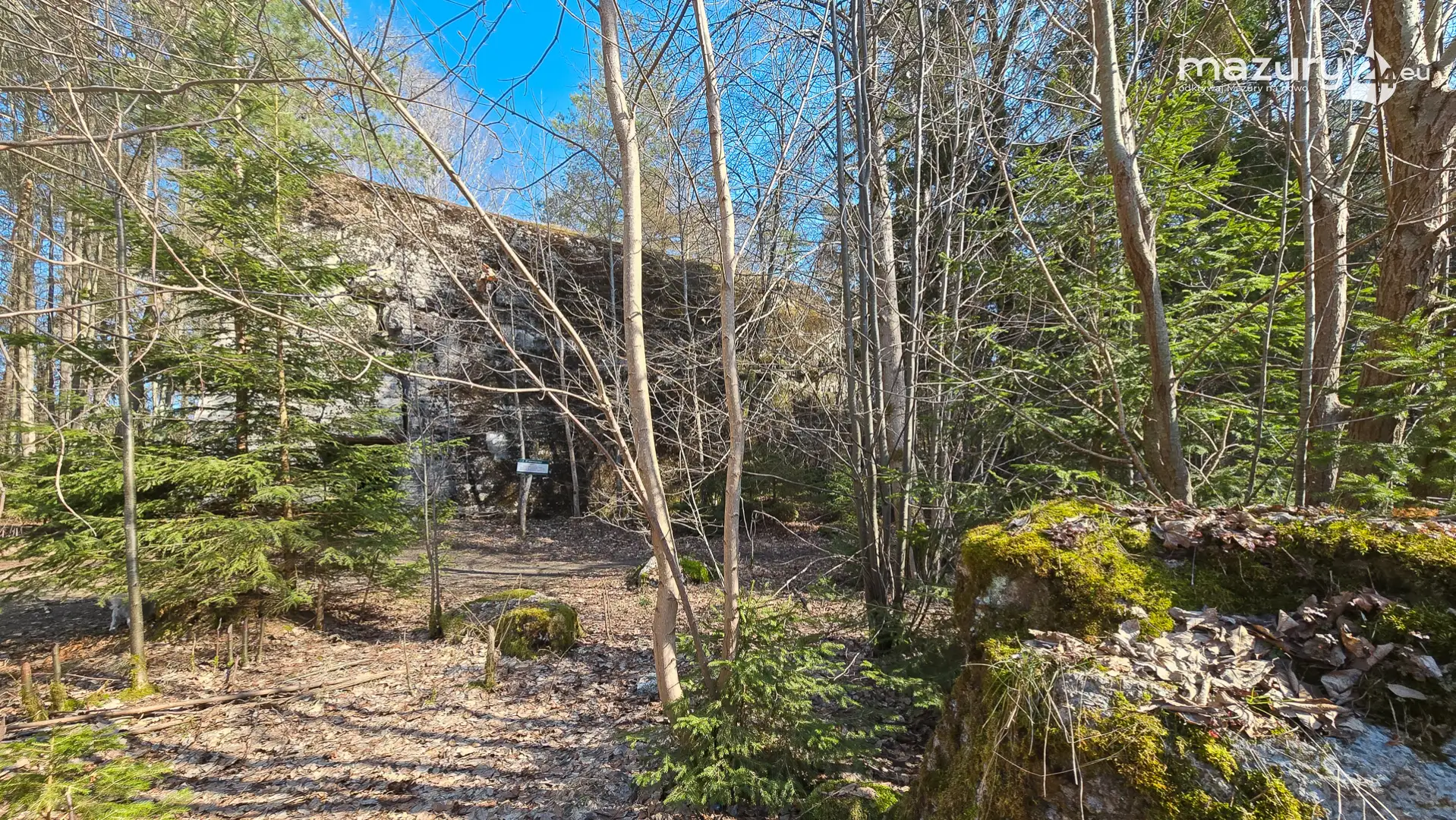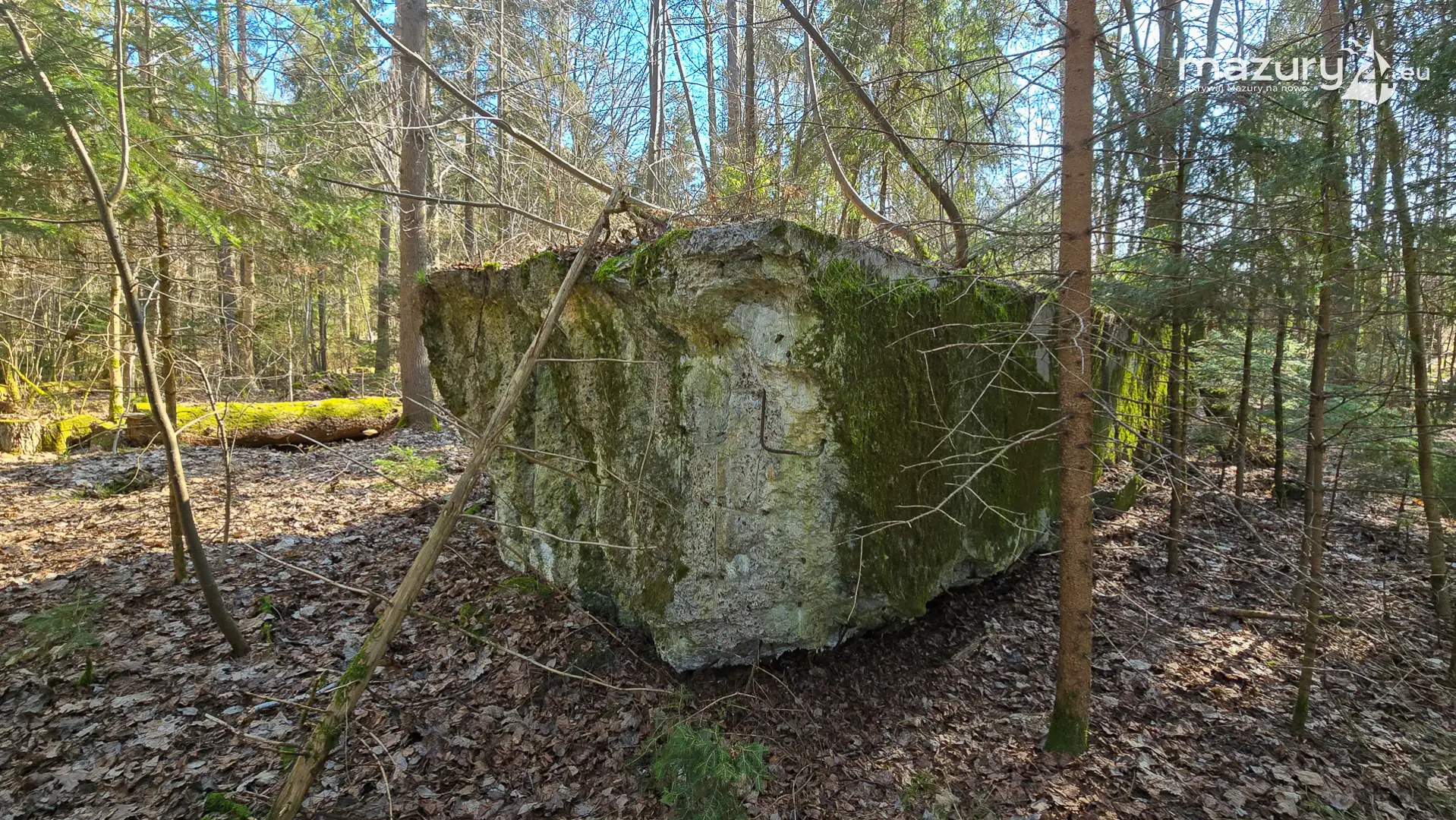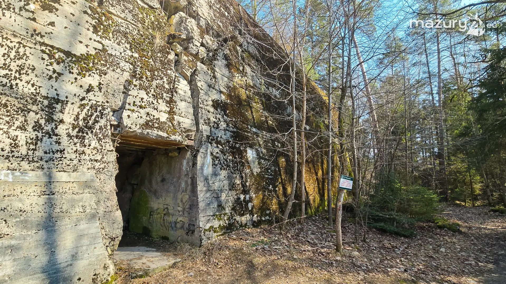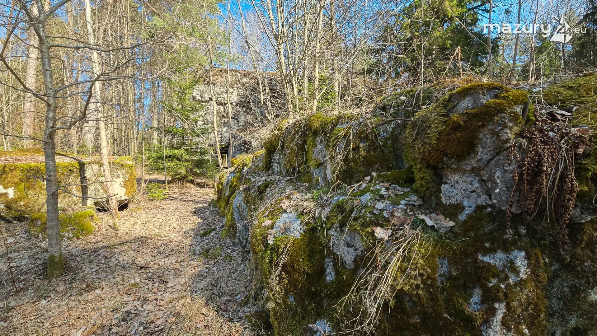 Wczesnowiosenna sceneria odsłania Hochwald w zupełnie innym świetle – brak liści i roślinności pozwala dostrzec więcej detali ukrytych na co dzień w lesie. Ruiny kwatery Heinricha Himmlera w Pozezdrzu, wysadzone w 1945 roku, ukazują dziś potęgę żelbetowych konstrukcji i skalę całego kompleksu. To moment, gdy historia staje się bardziej czytelna – odsłonięte bryły bunkrów wyraźnie rysują dawny układ tej tajnej instalacji.