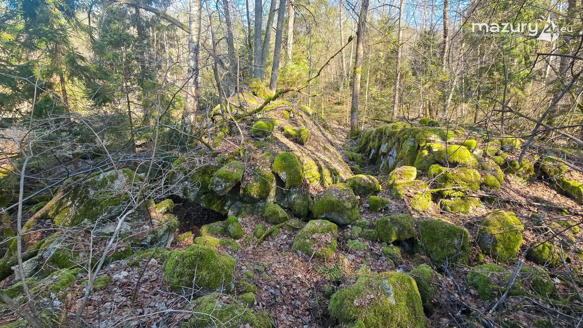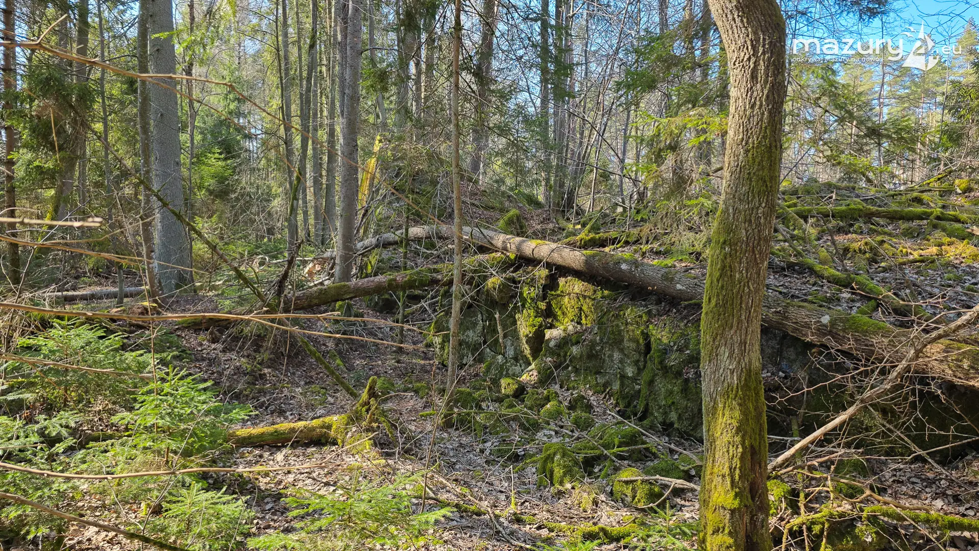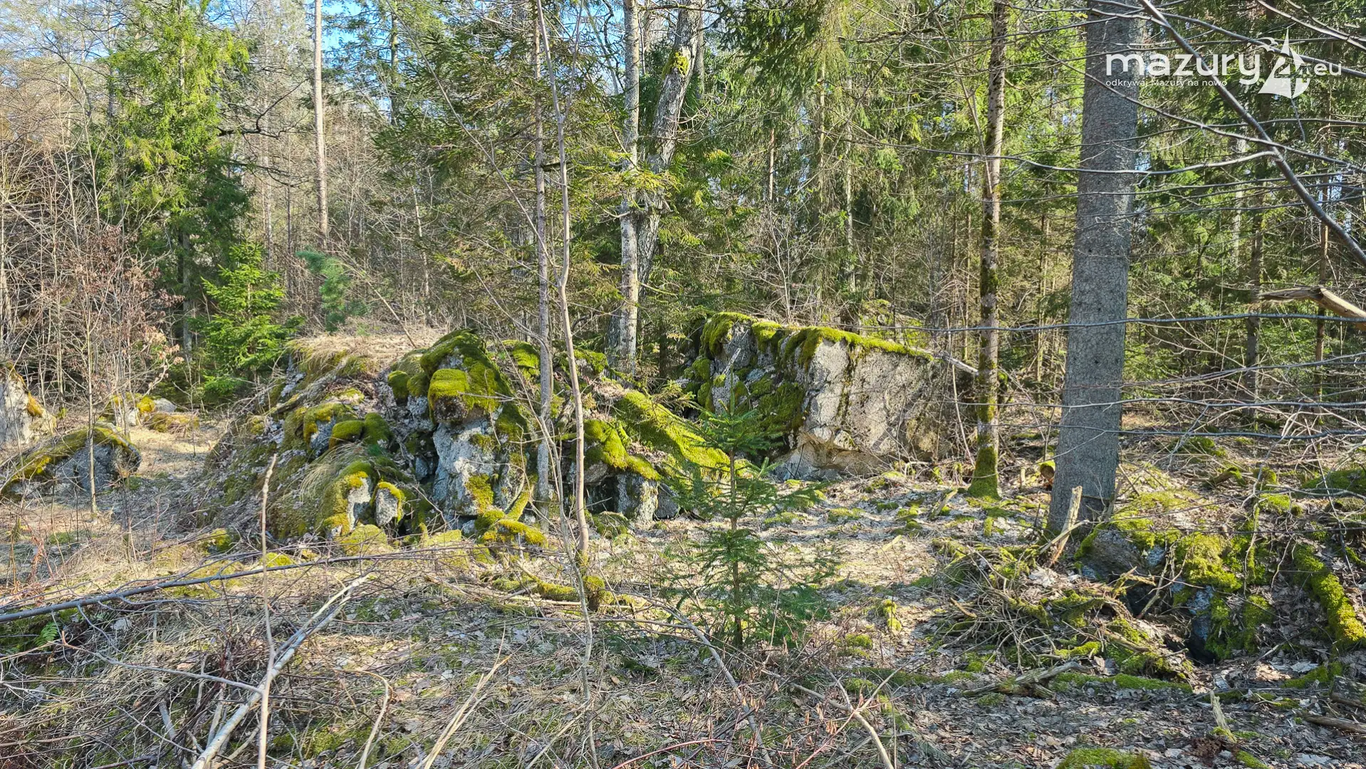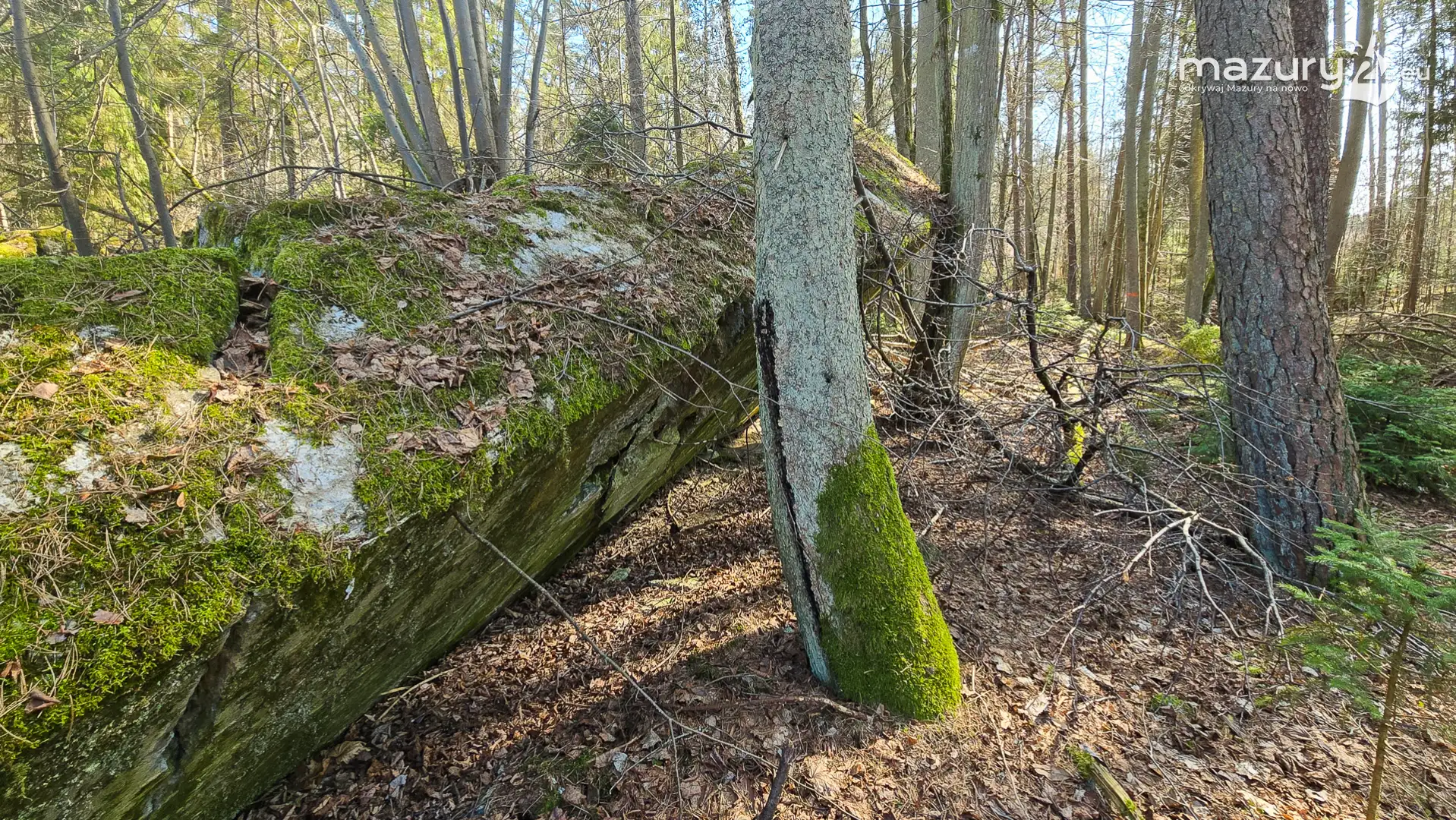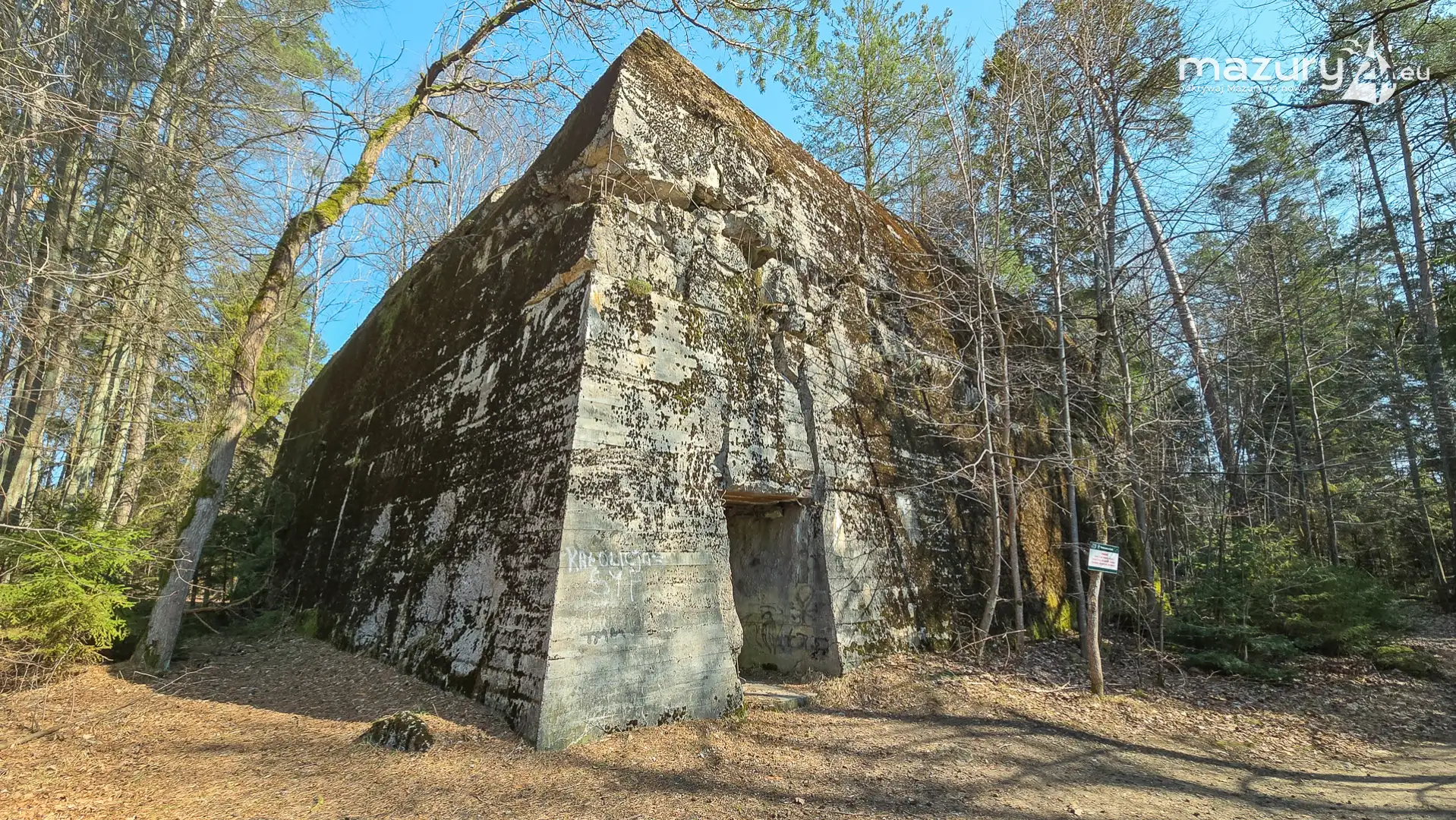 Wczesnowiosenna sceneria odsłania Hochwald w zupełnie innym świetle – brak liści i roślinności pozwala dostrzec więcej detali ukrytych na co dzień w lesie. Ruiny kwatery Heinricha Himmlera w Pozezdrzu, wysadzone w 1945 roku, ukazują dziś potęgę żelbetowych konstrukcji i skalę całego kompleksu. To moment, gdy historia staje się bardziej czytelna – odsłonięte bryły bunkrów wyraźnie rysują dawny układ tej tajnej instalacji.