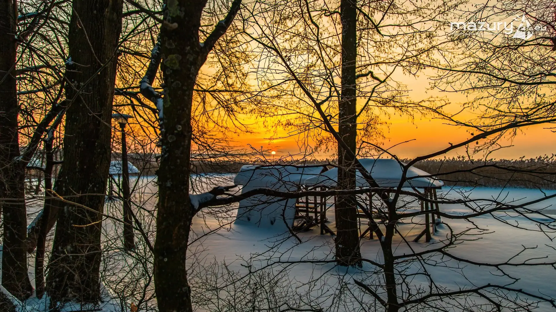 Zimowy zachód słońca między jeziorem Dargin i Sztynorckie