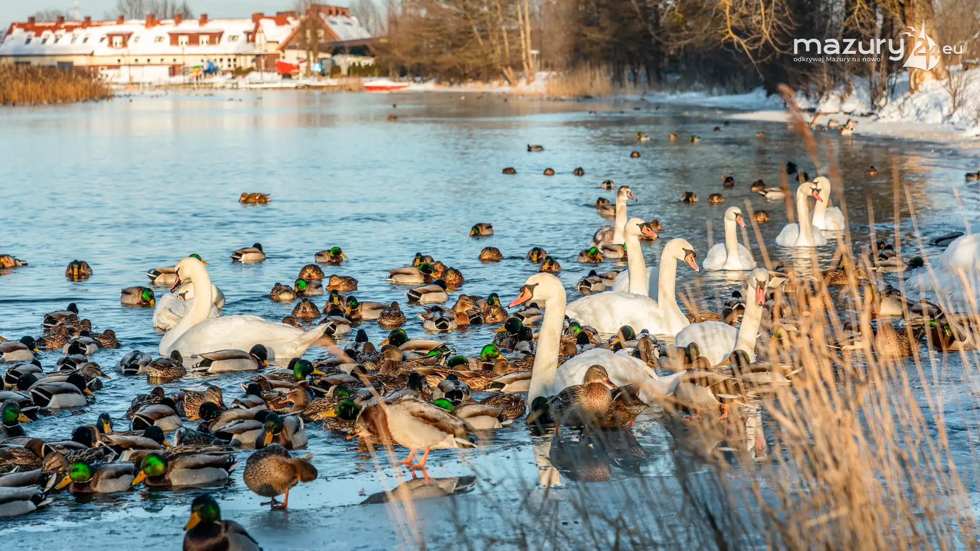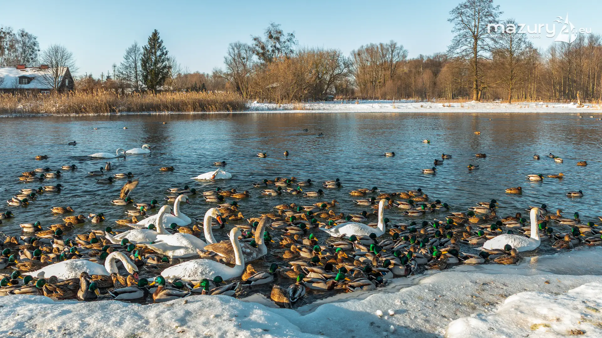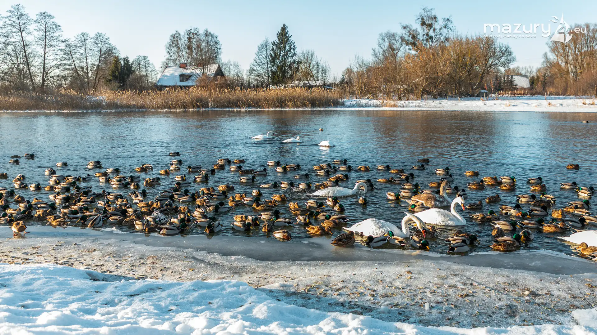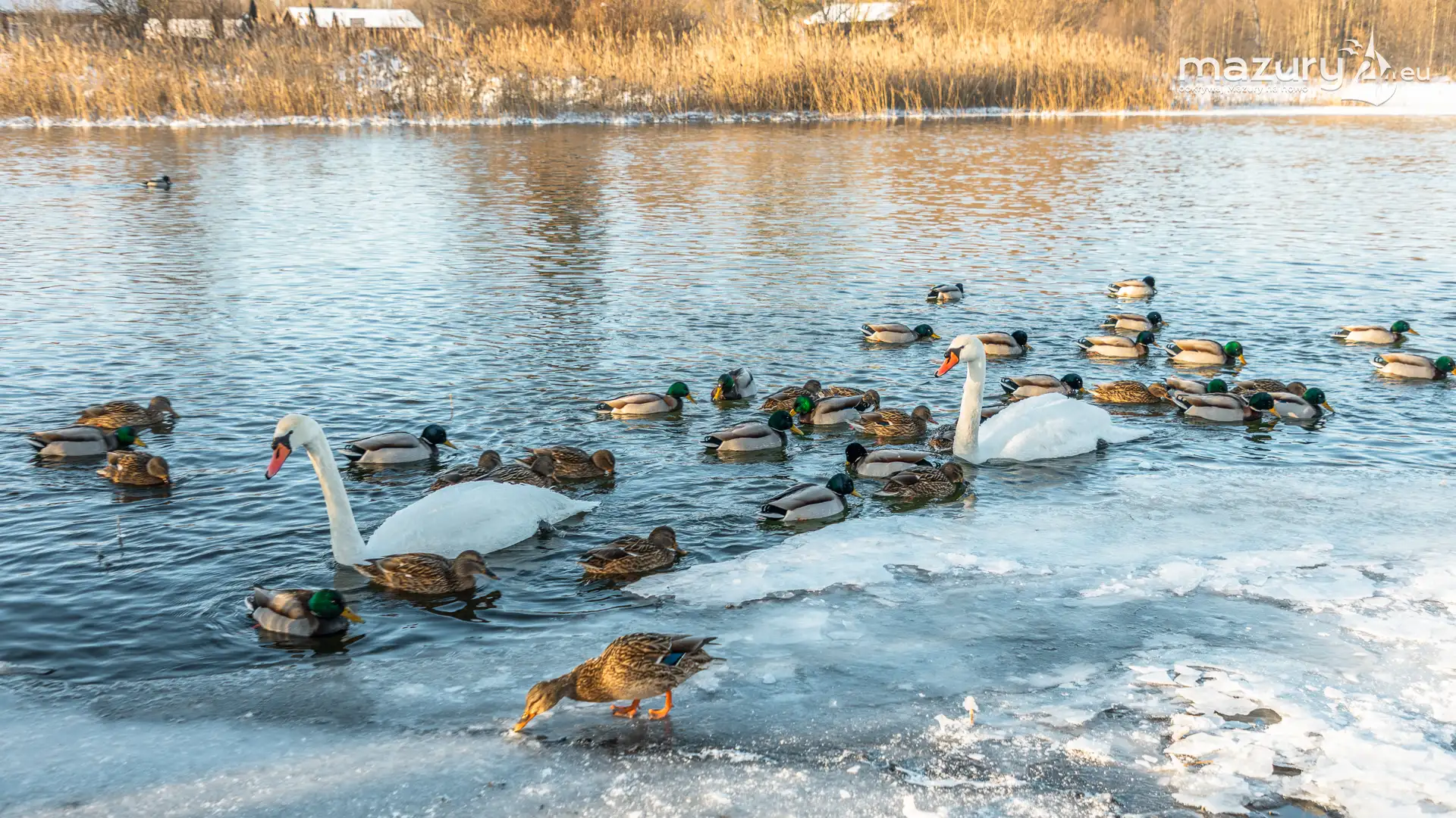 Kaczki i łabędzie w mroźne popołudnie na Pisie, luty 2026 r.