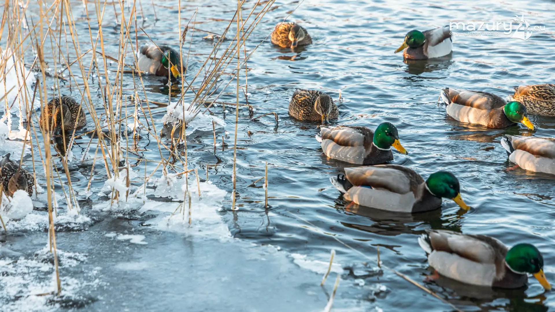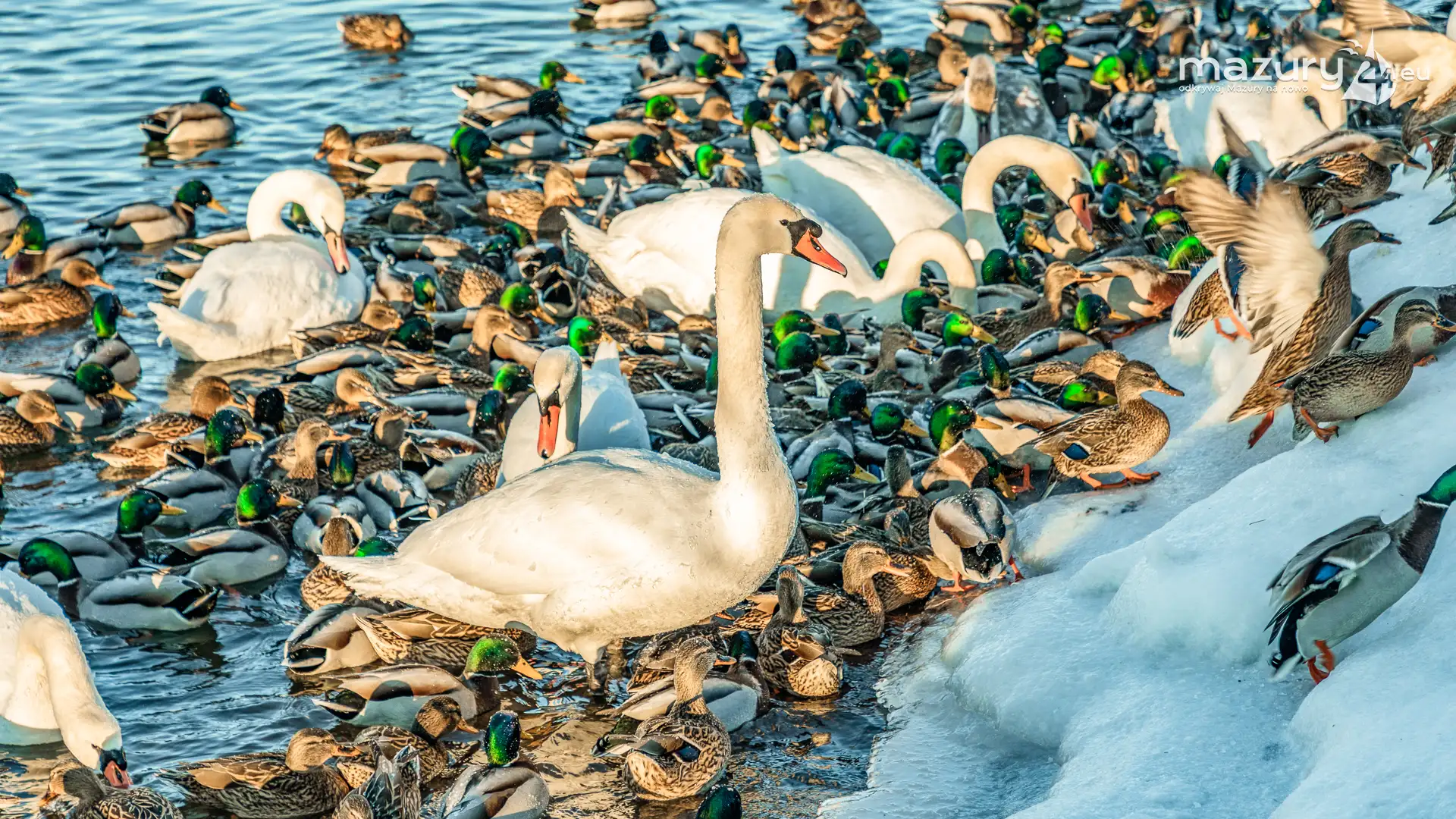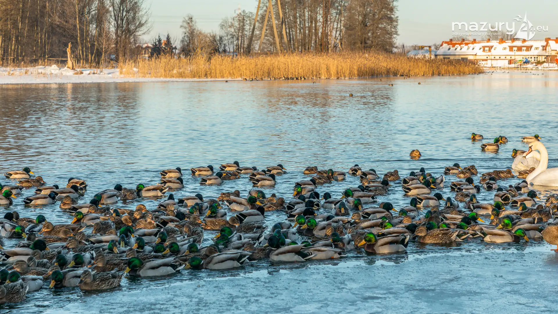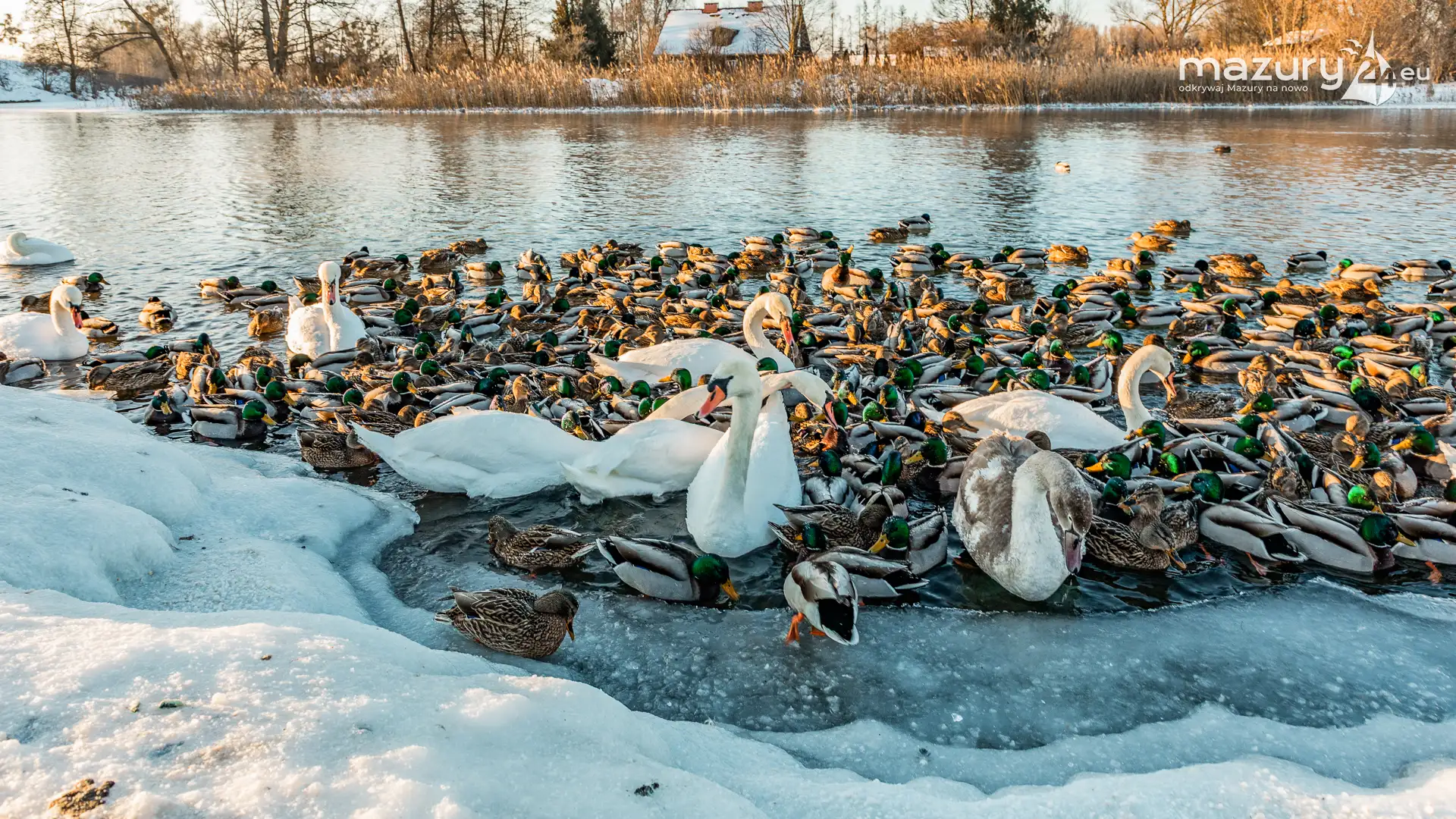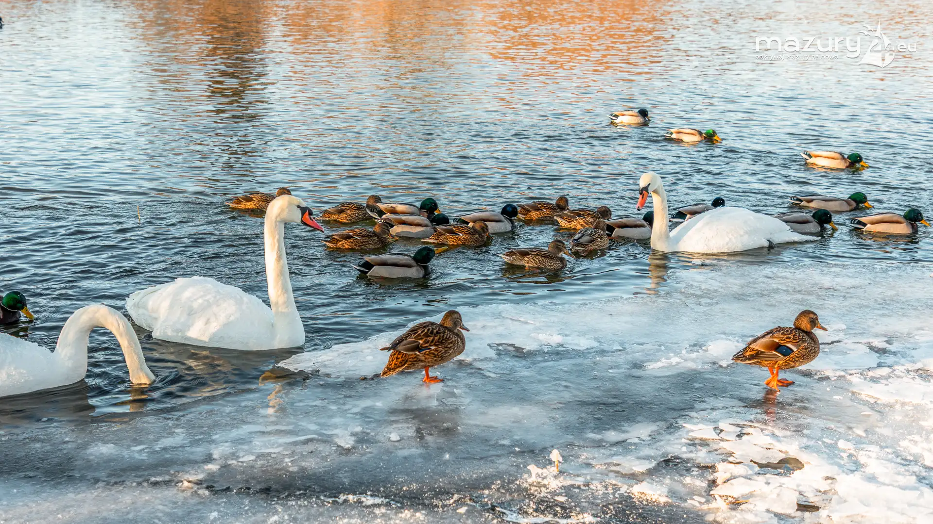 Kaczki i łabędzie w mroźne popołudnie na Pisie, luty 2026 r.