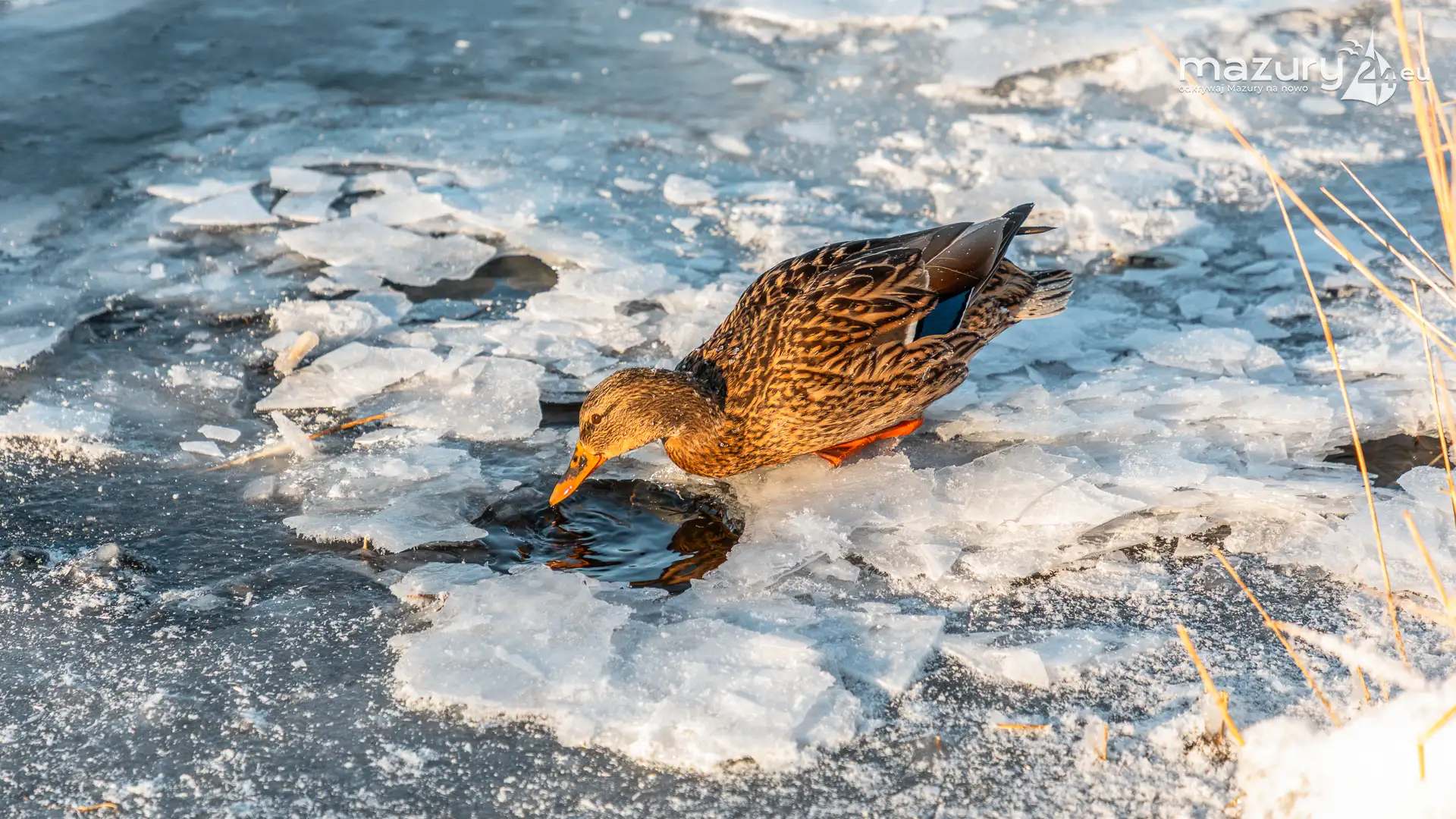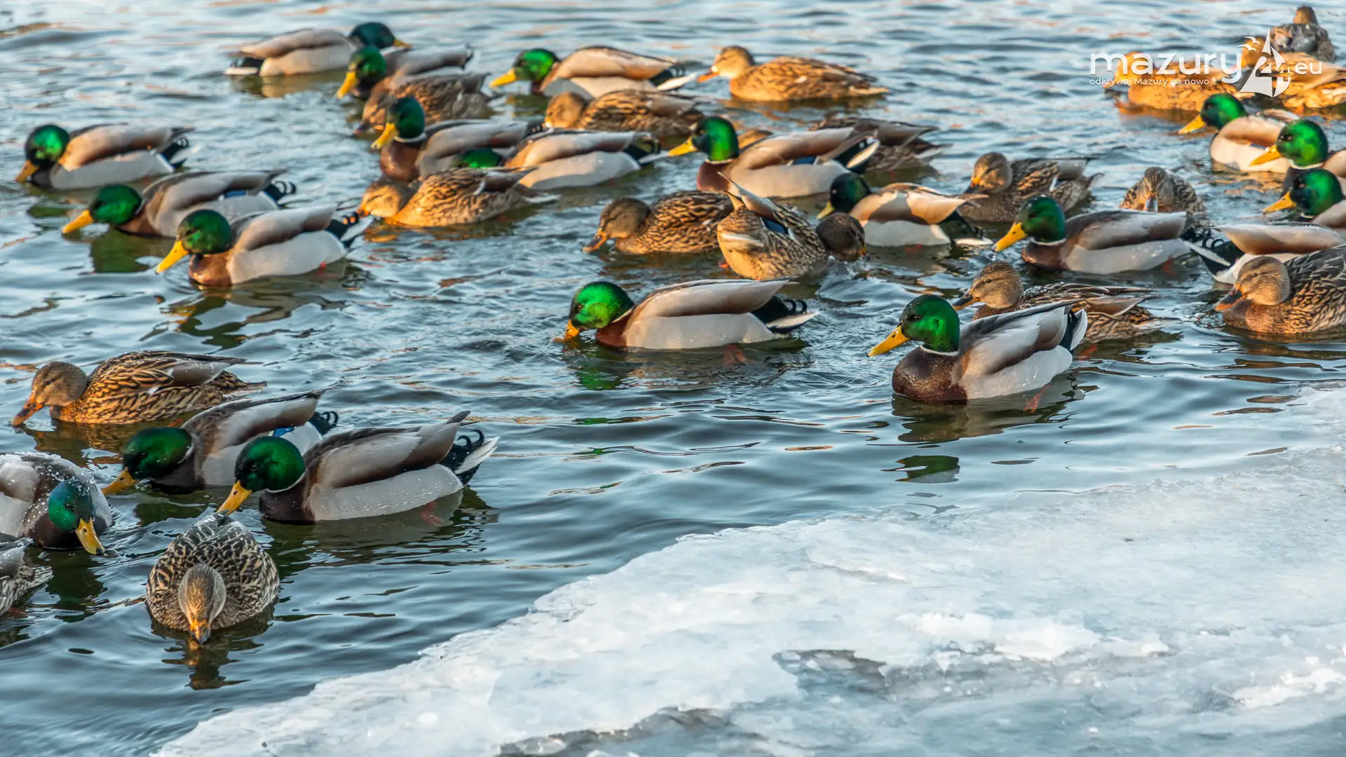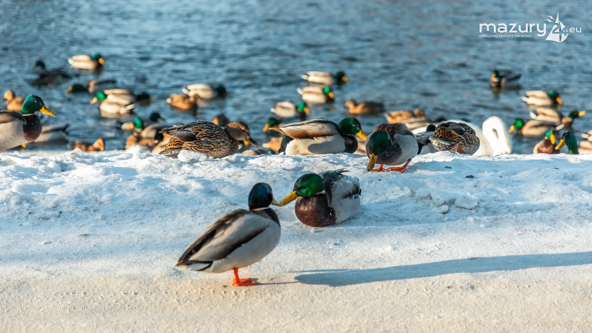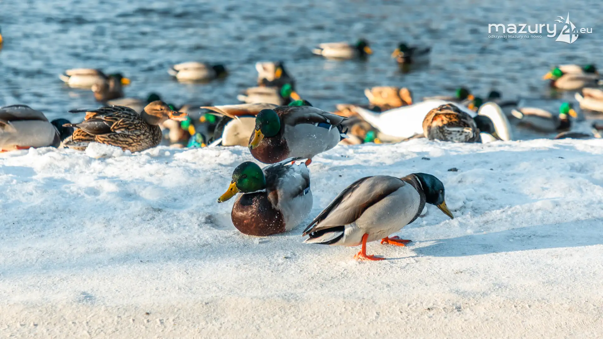 Kaczki i łabędzie w mroźne popołudnie na Pisie, luty 2026 r.