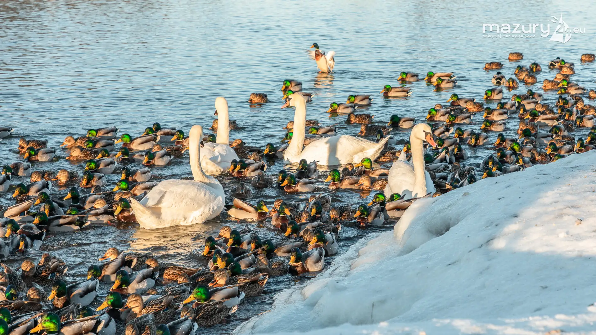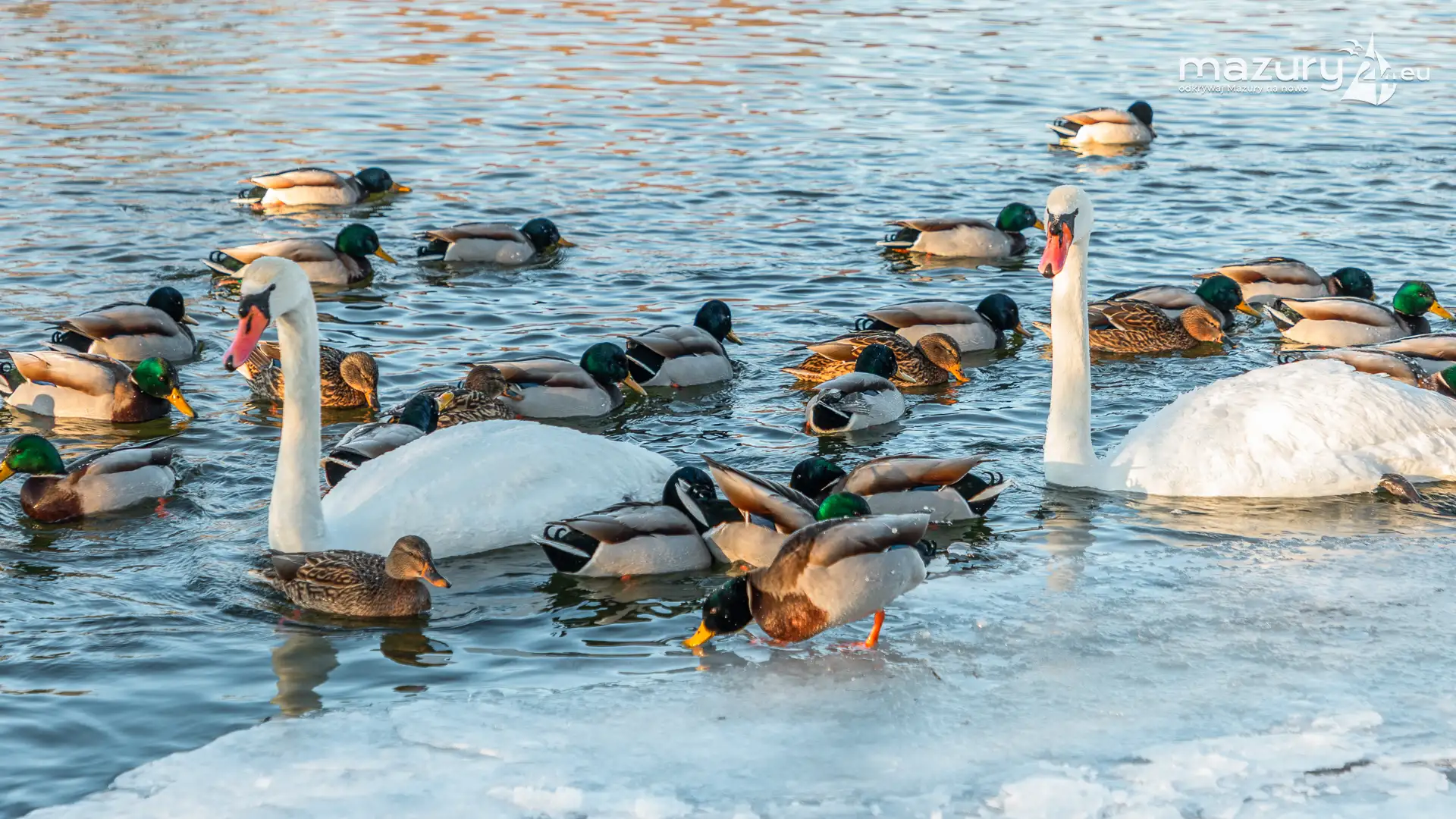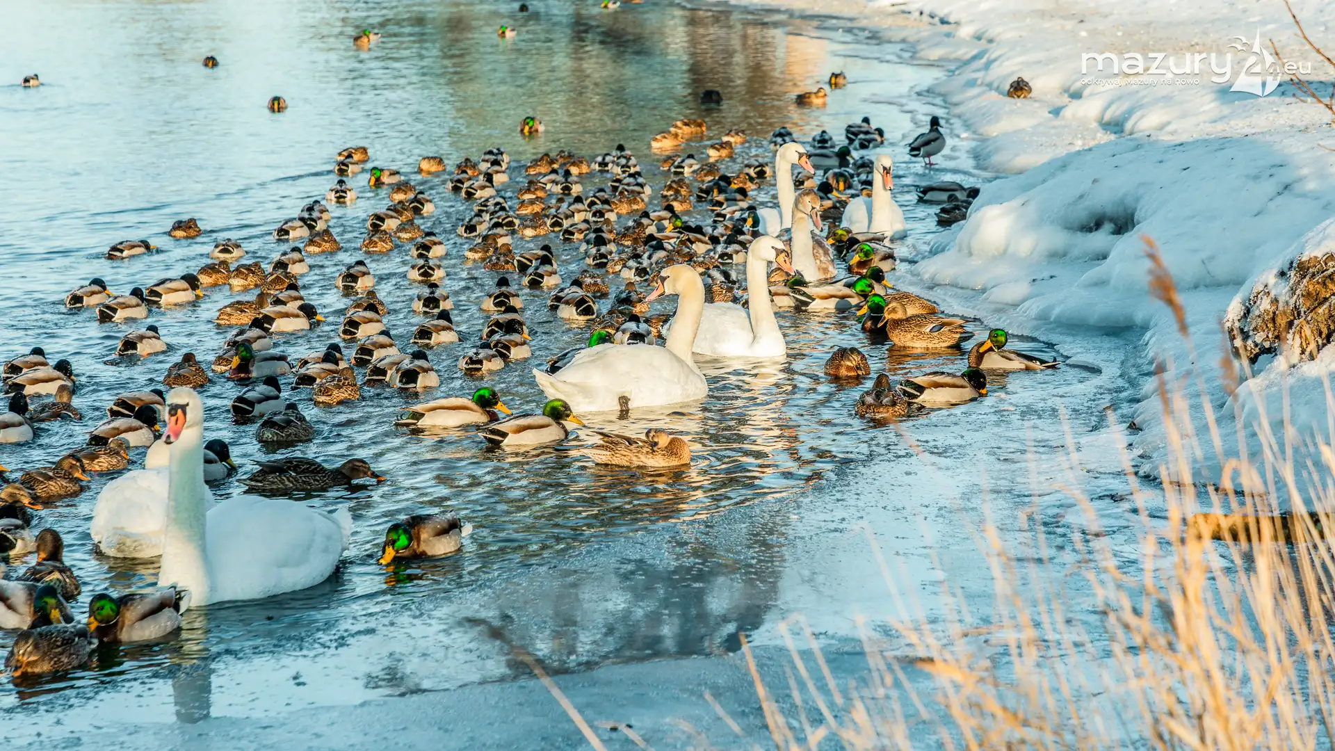 Kaczki i łabędzie w mroźne popołudnie na Pisie, luty 2026 r. - zdjęcie 1