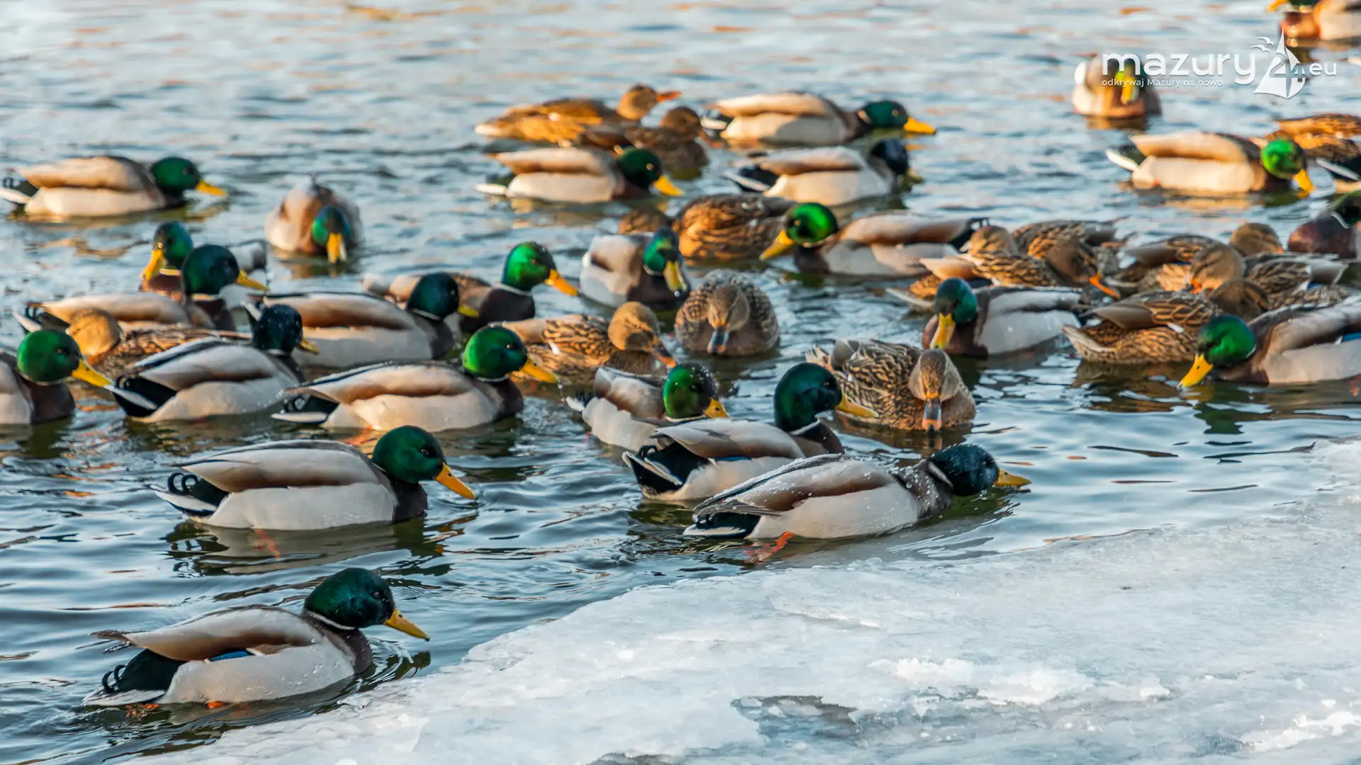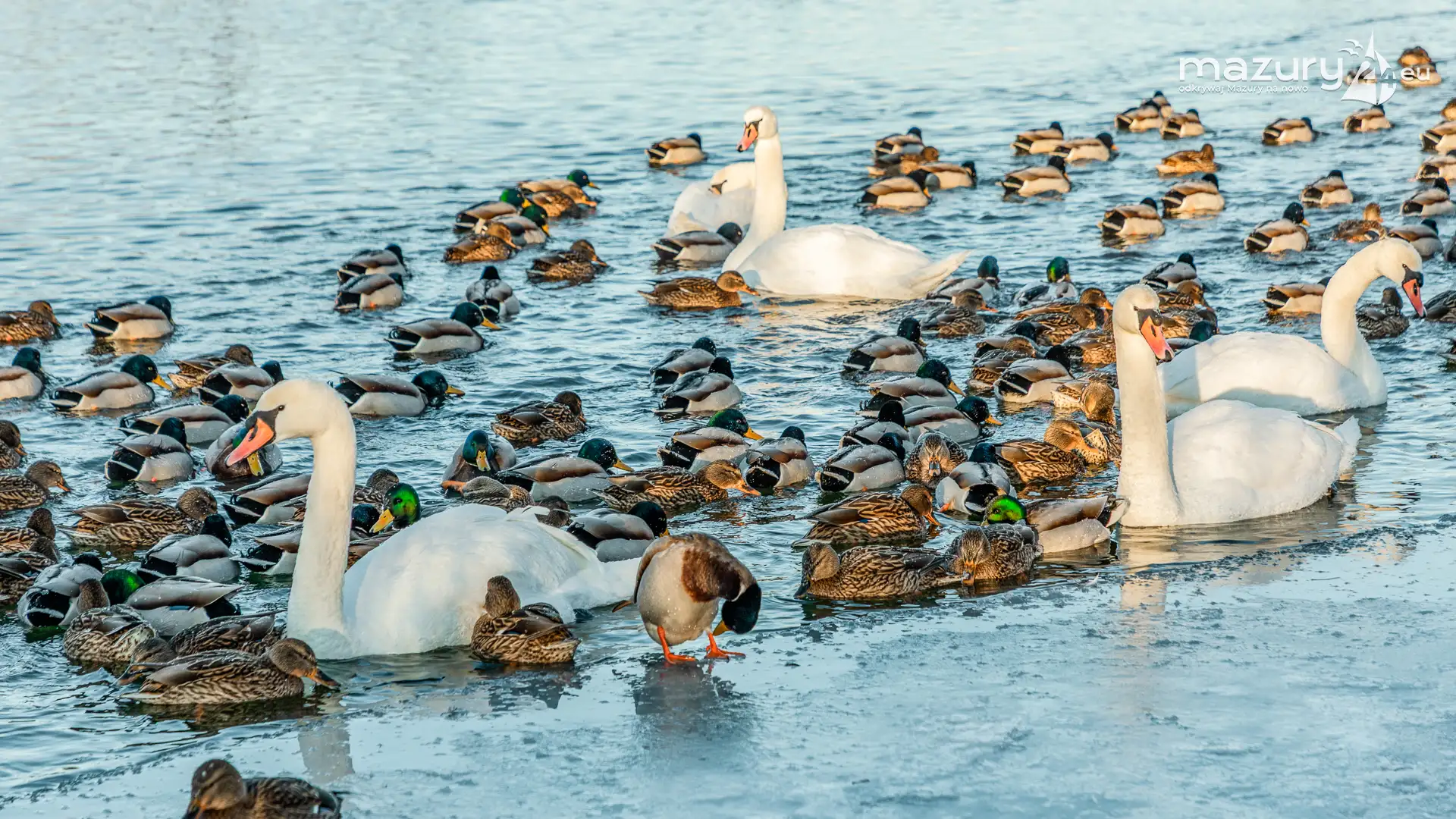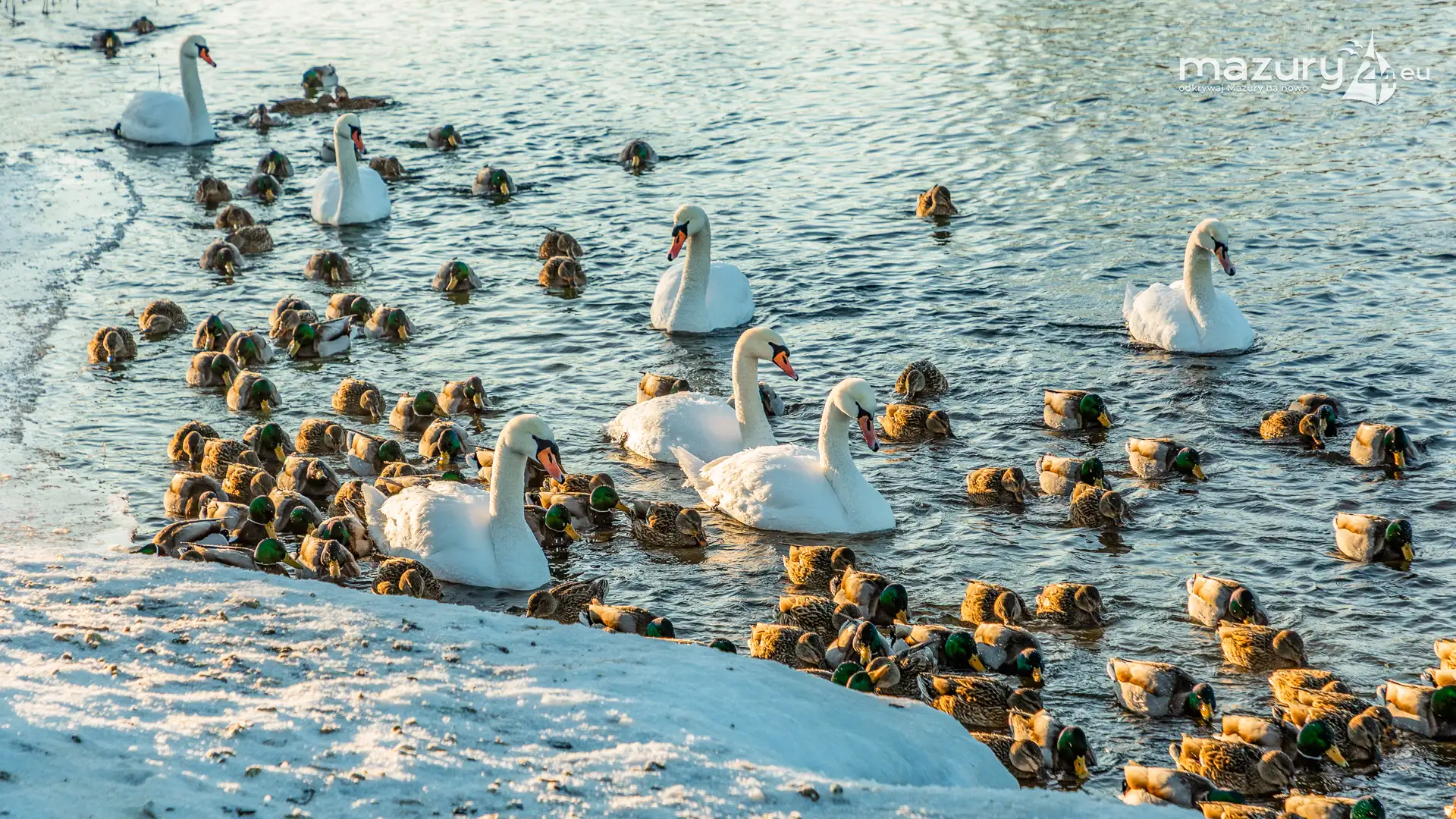 Kaczki i łabędzie w mroźne popołudnie na Pisie, luty 2026 r. - zdjęcie 1