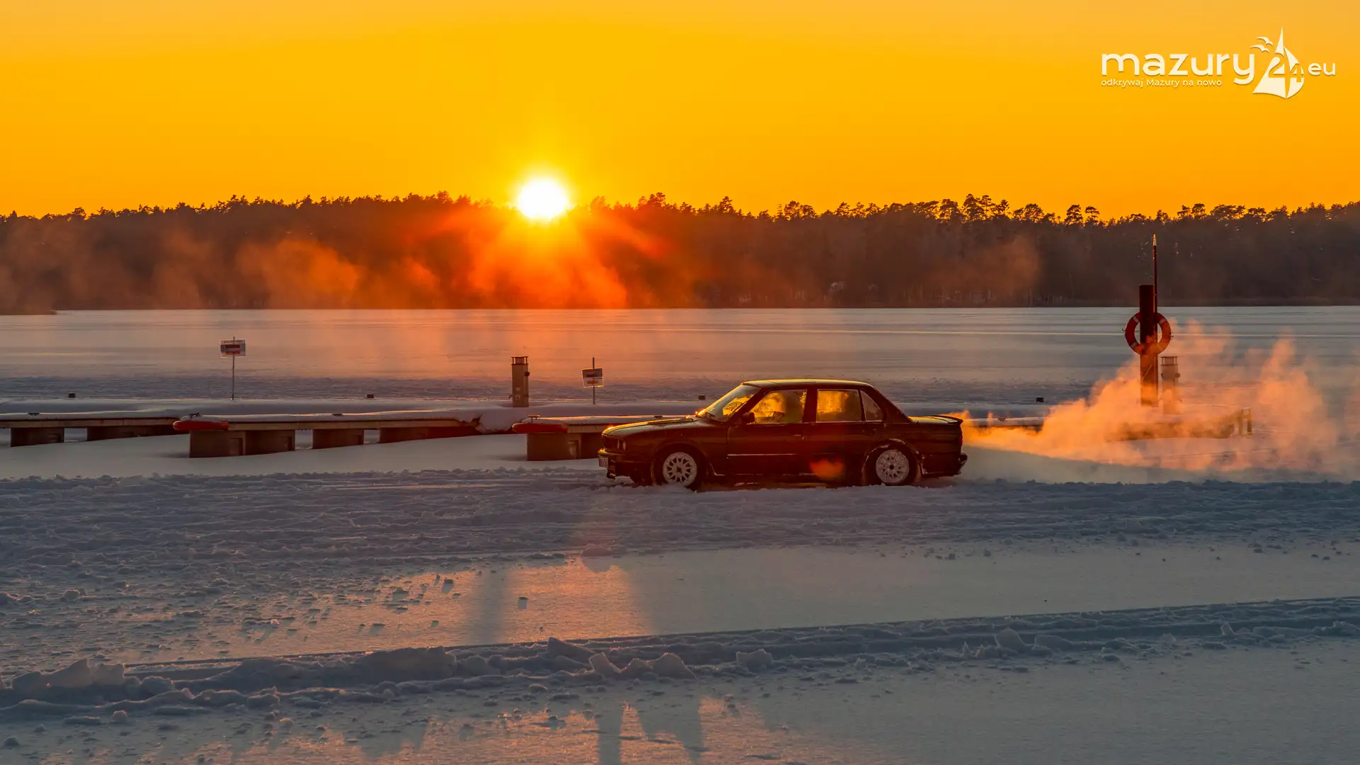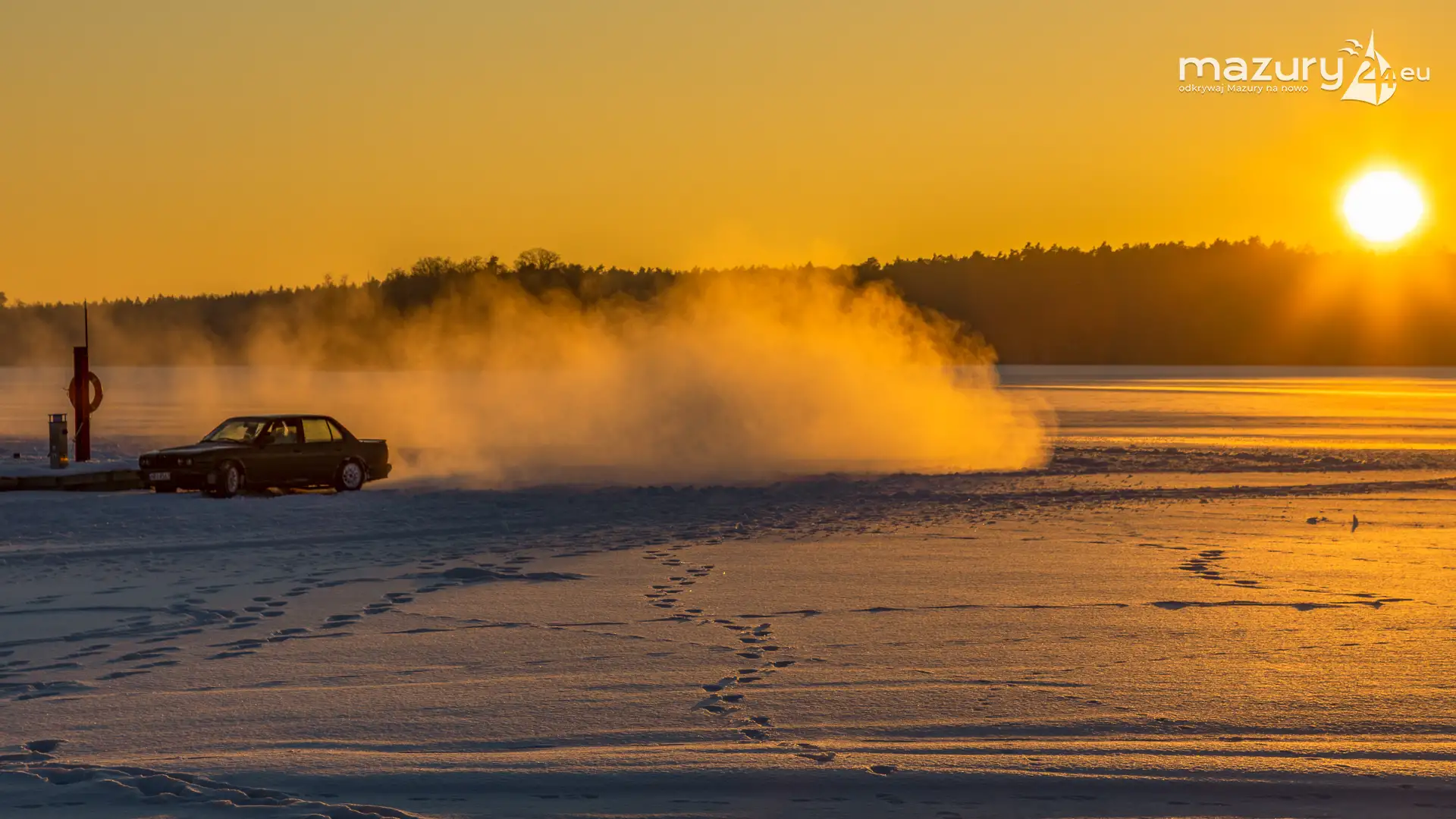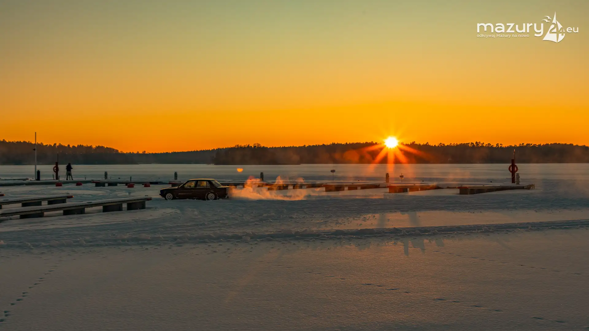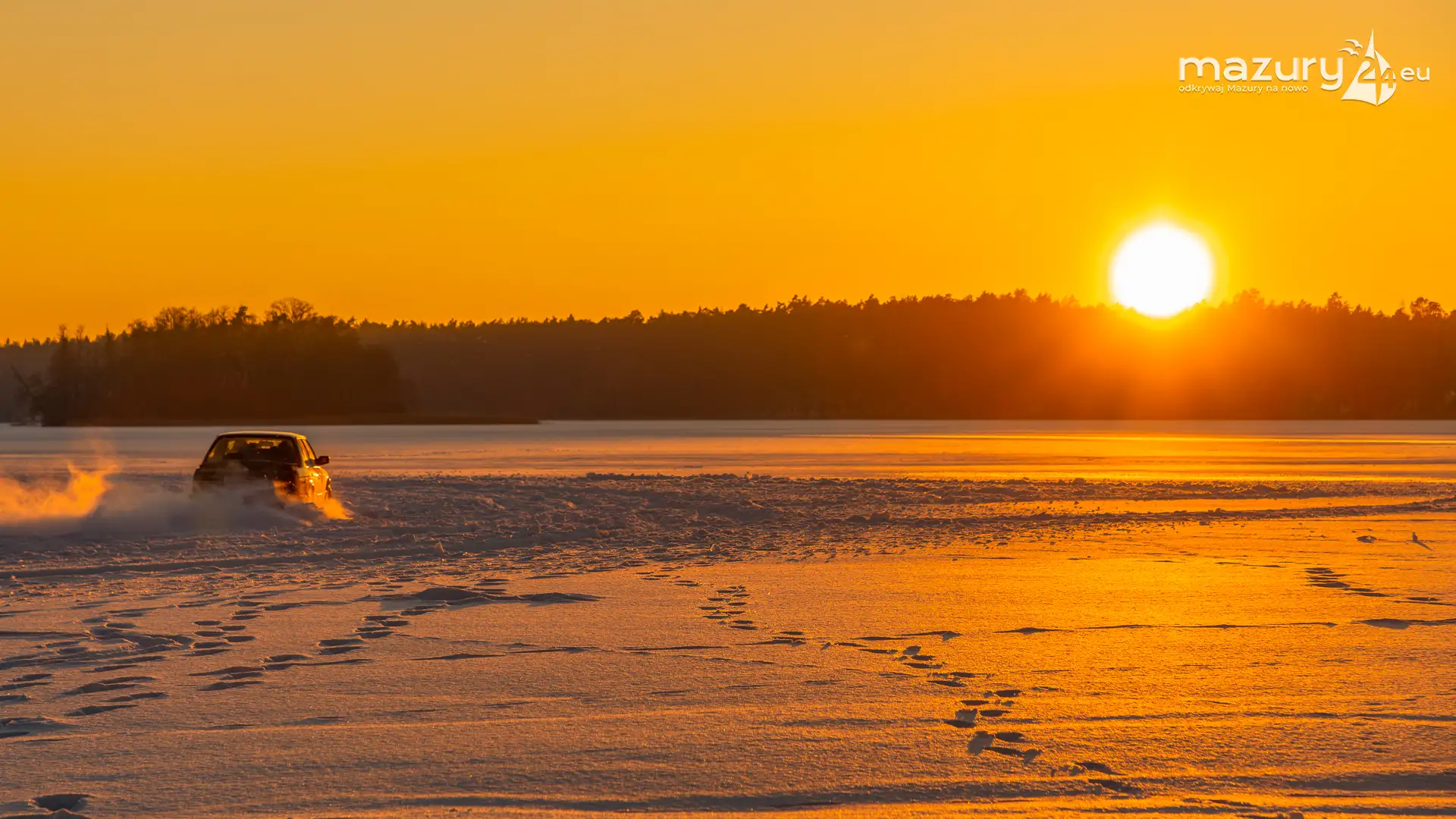 Dzisiejszy zachód słońca nad jeziorem Bełdany był wyjątkowo inny. Było bardzo zimno (-18 stopni C), słońce pięknie ułożyło się nad horyzontem, a w tle... obserwowaliśmy drifty samochodem... Zawsze zakładaliśmy, że mazurskie zachody obserwuje się z hotelowego pokoju, z plaży, z jachtu lub kajaka, ale z... rozpędzonego po lodzie i śniegu samochodu? No nic, sroga zima, jeziora skute lodem na 25-30 cm to nowe możliwości i perspektywy...