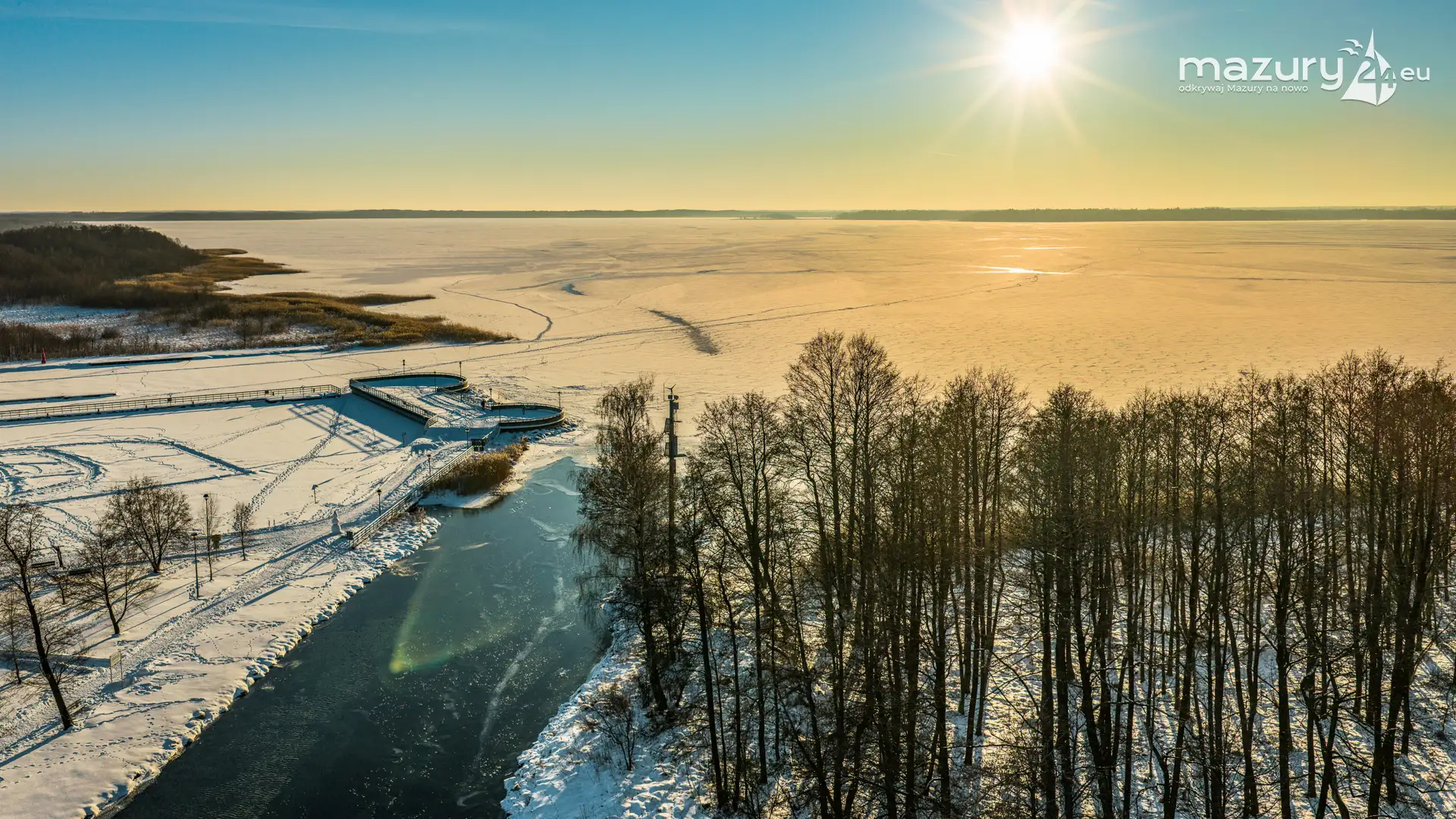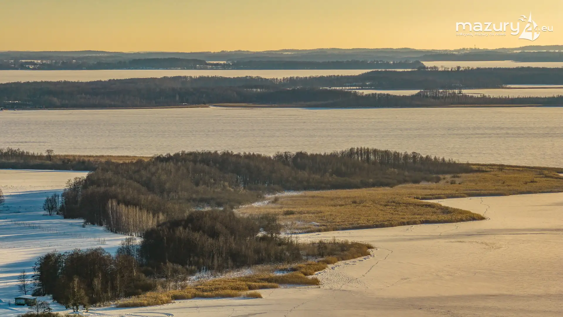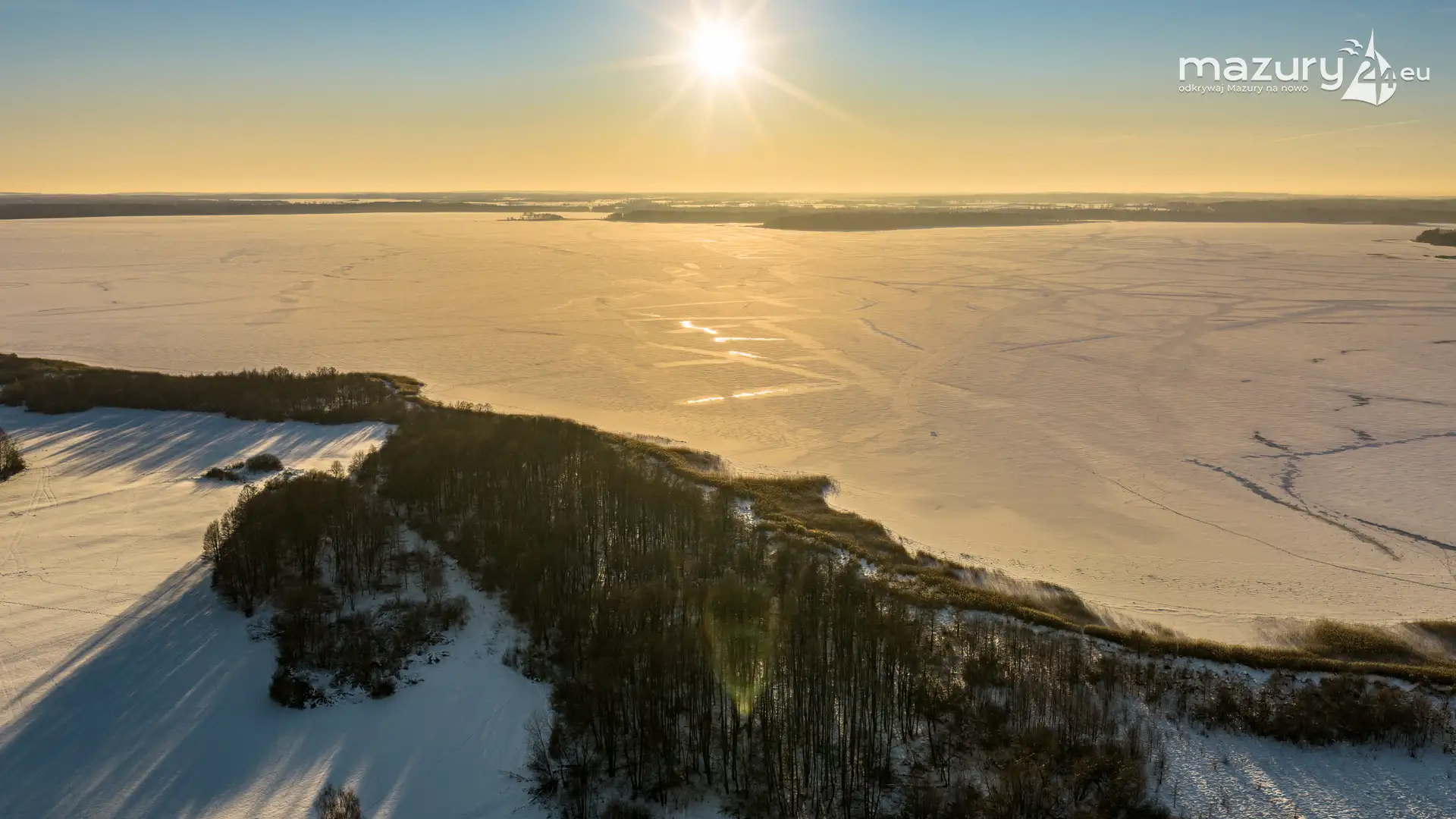 Zachód słońca nad jeziorem Kisajno z drona, Pierkunowo, luty 2026 r.