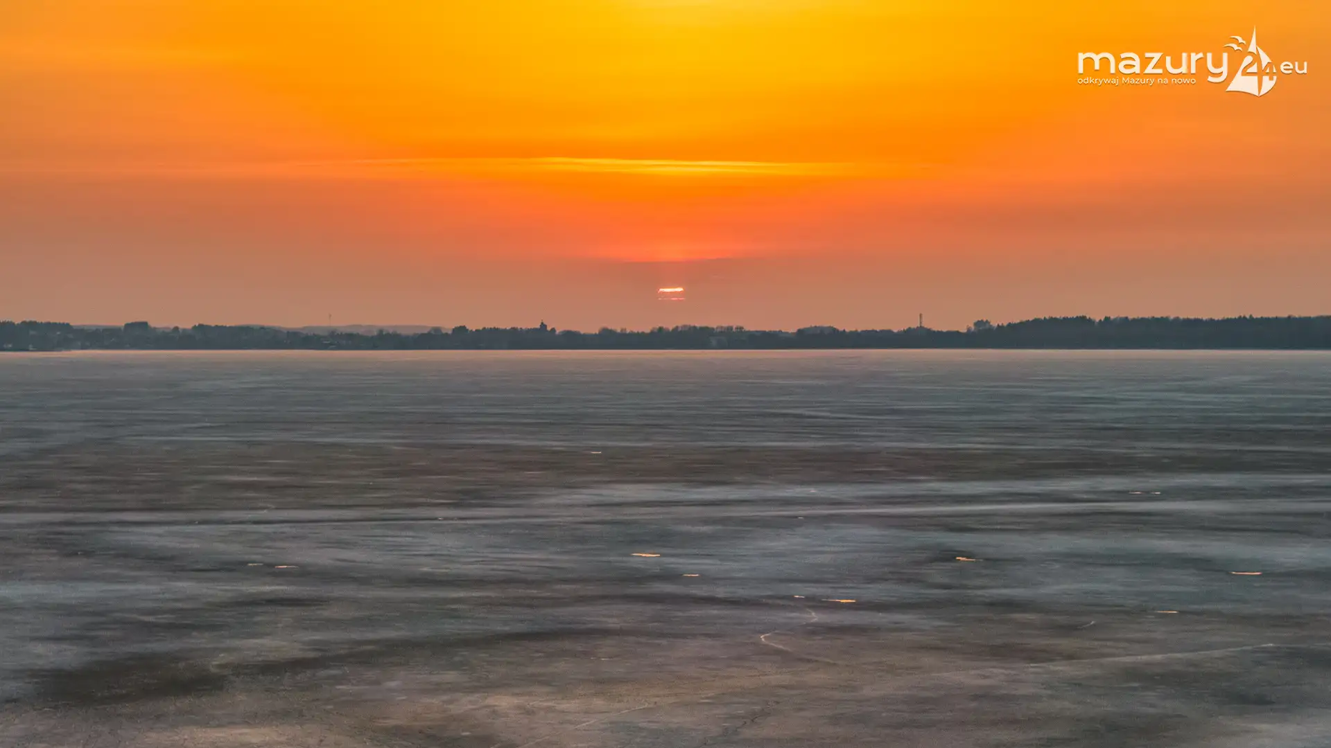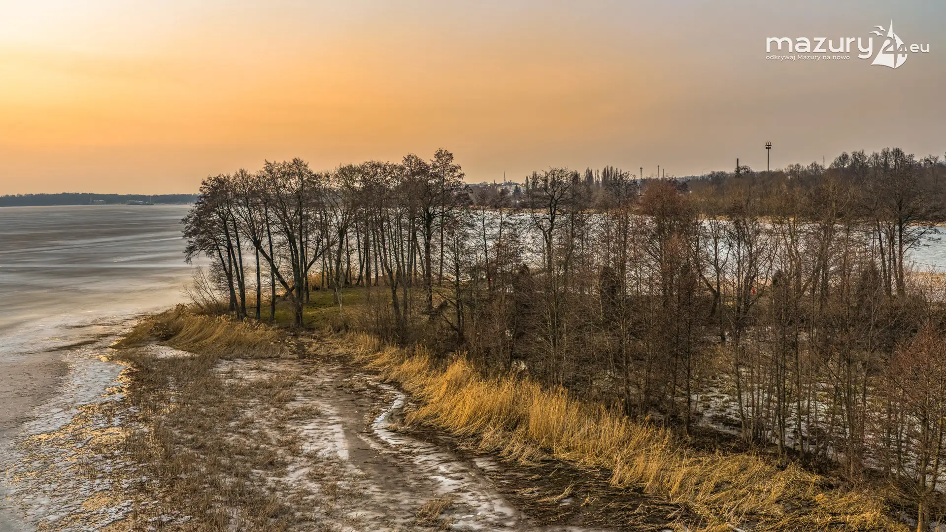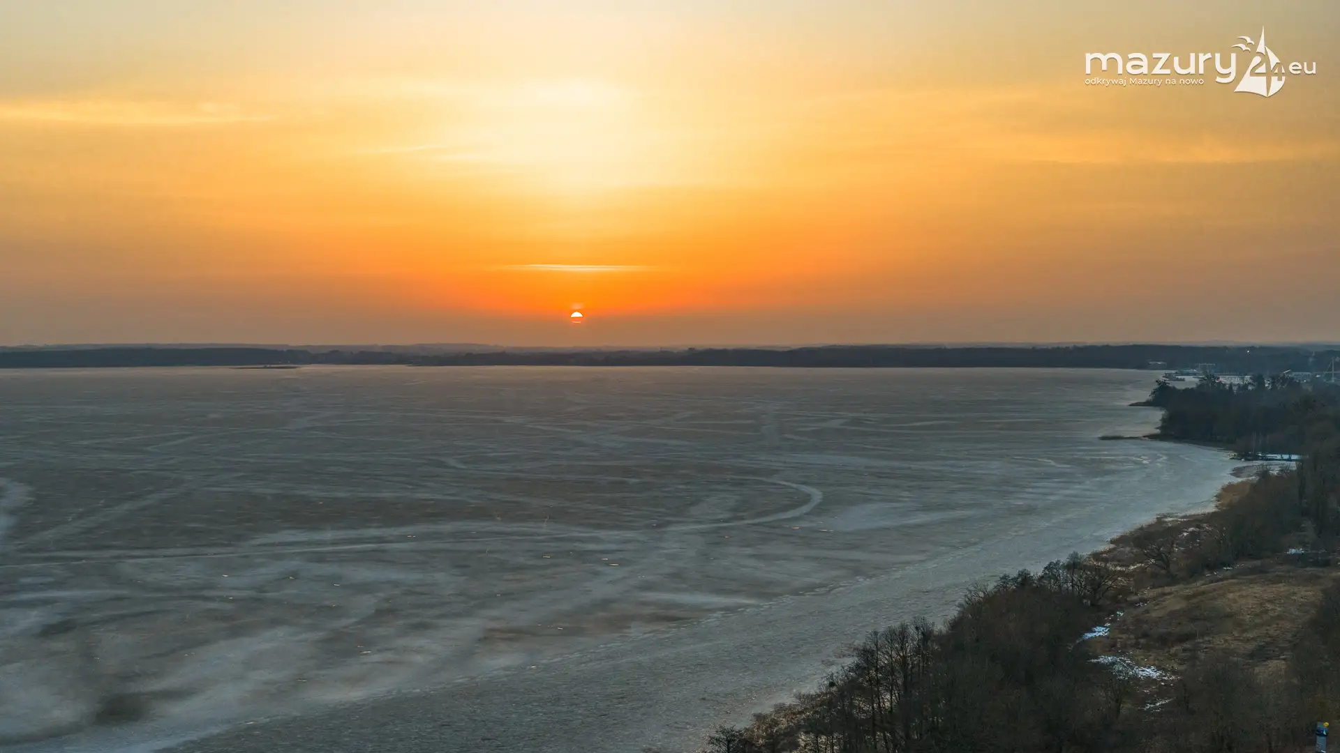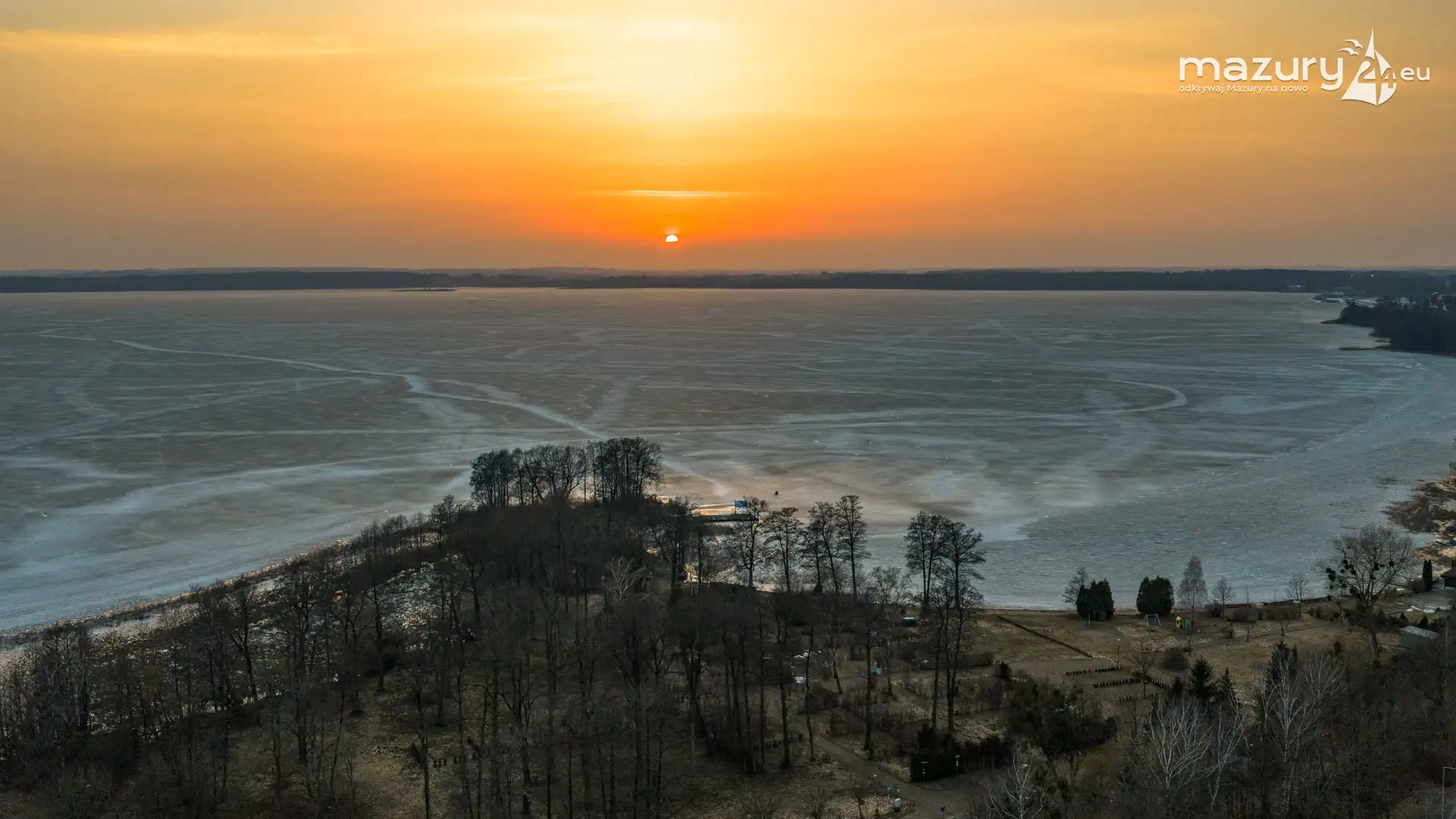 Zachód słońca nad wsią i jeziorem Stręgiel, marzec 2026 r.
