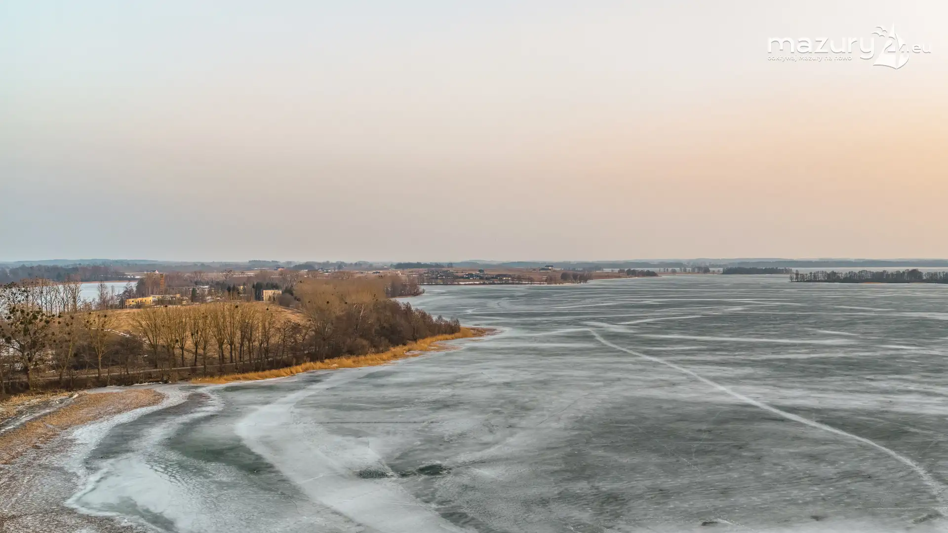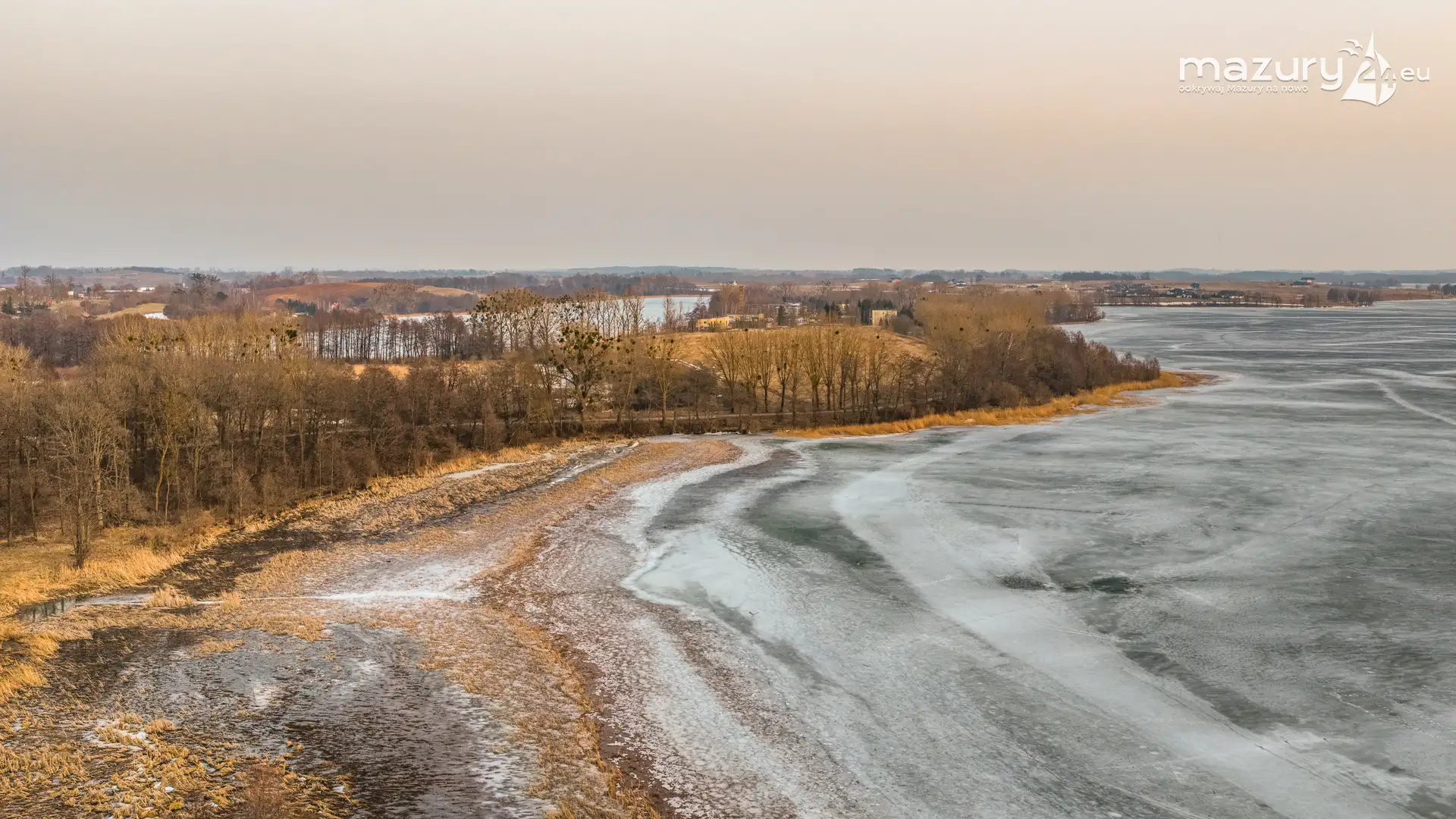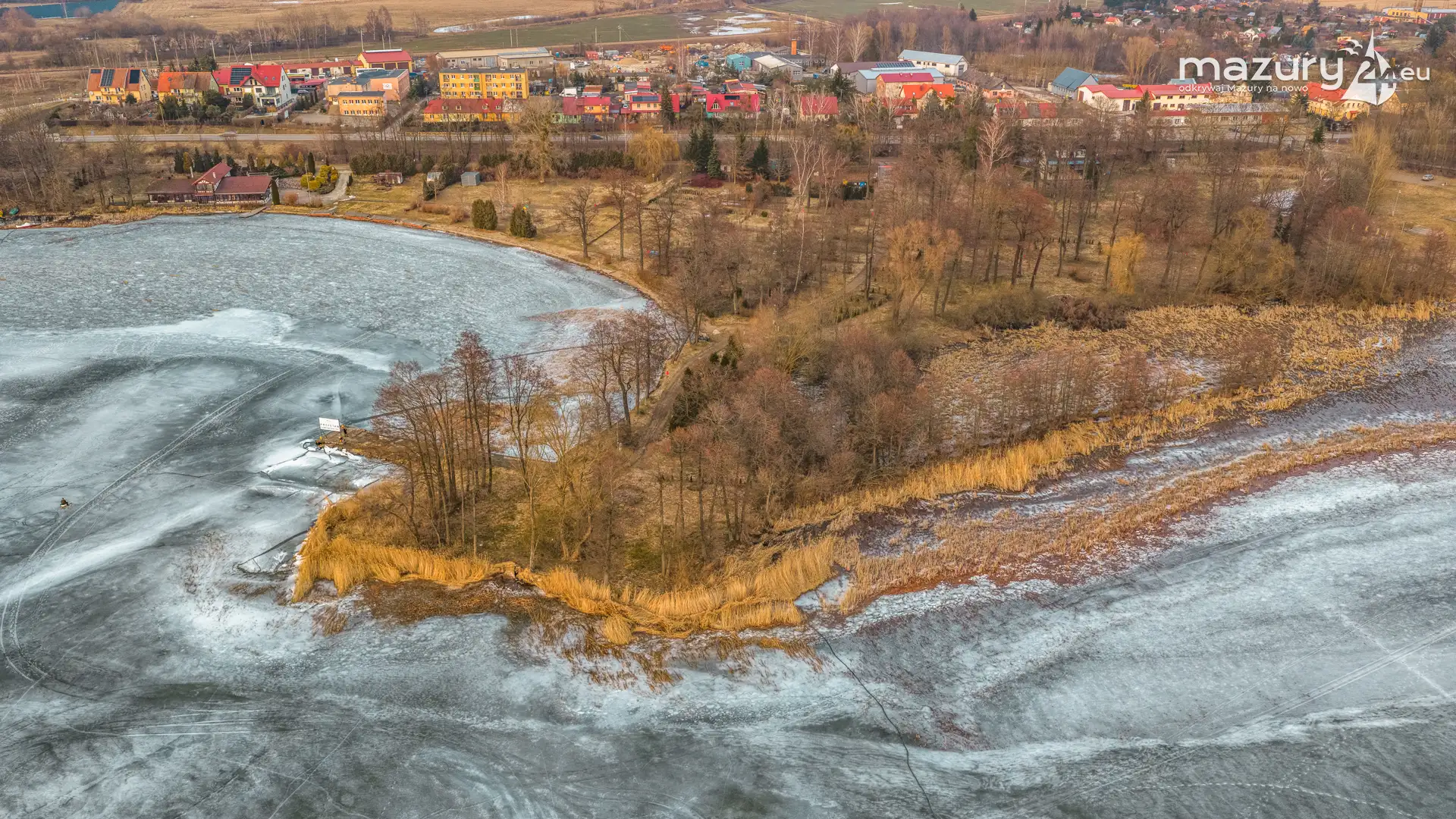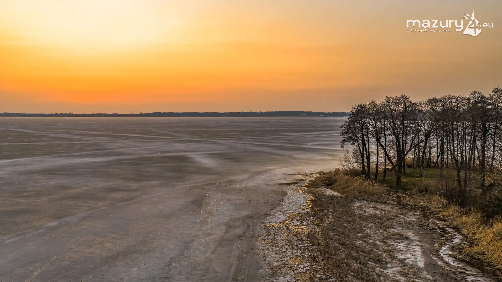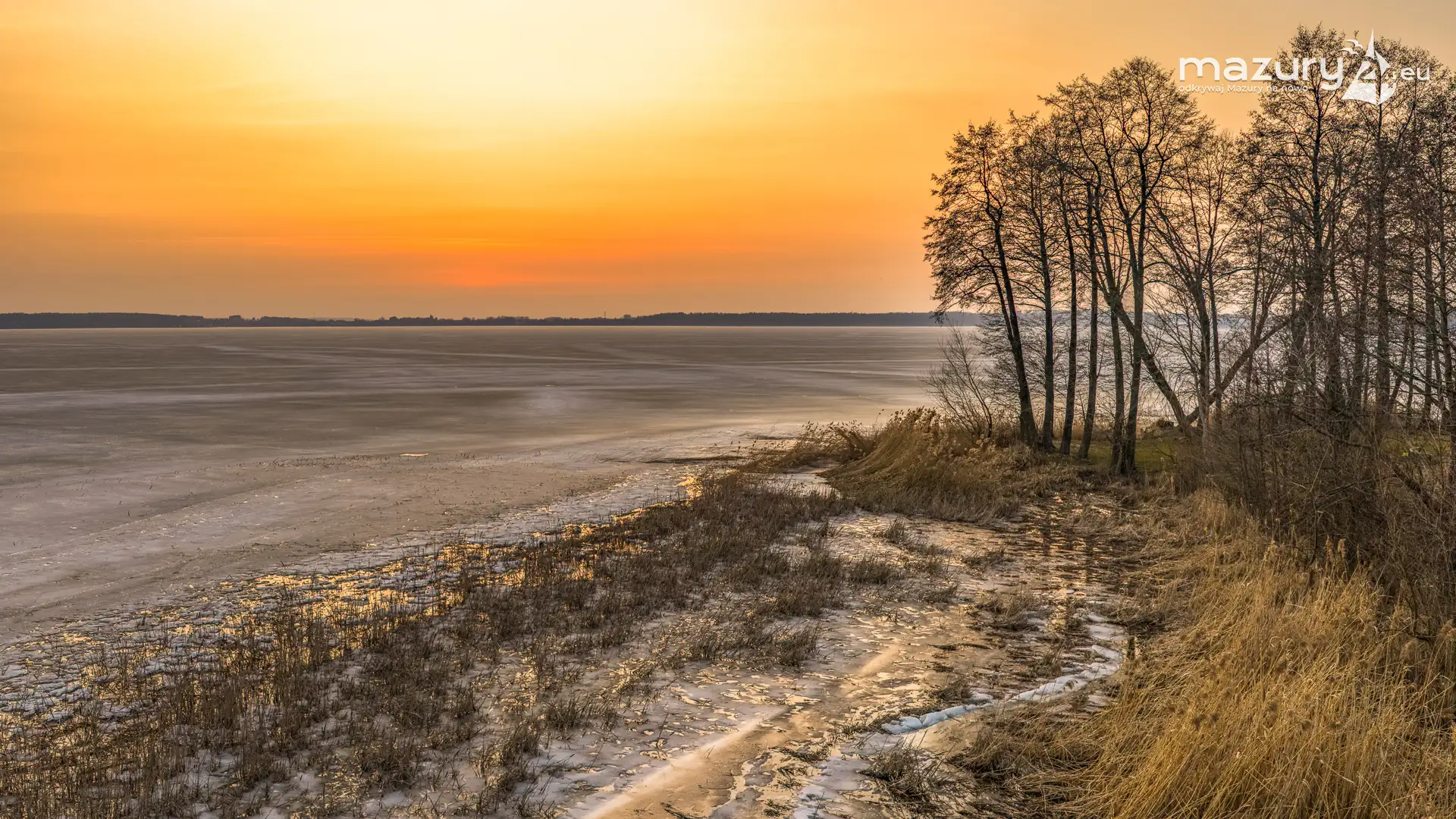 Zachód słońca nad wsią i jeziorem Stręgiel, marzec 2026 r.