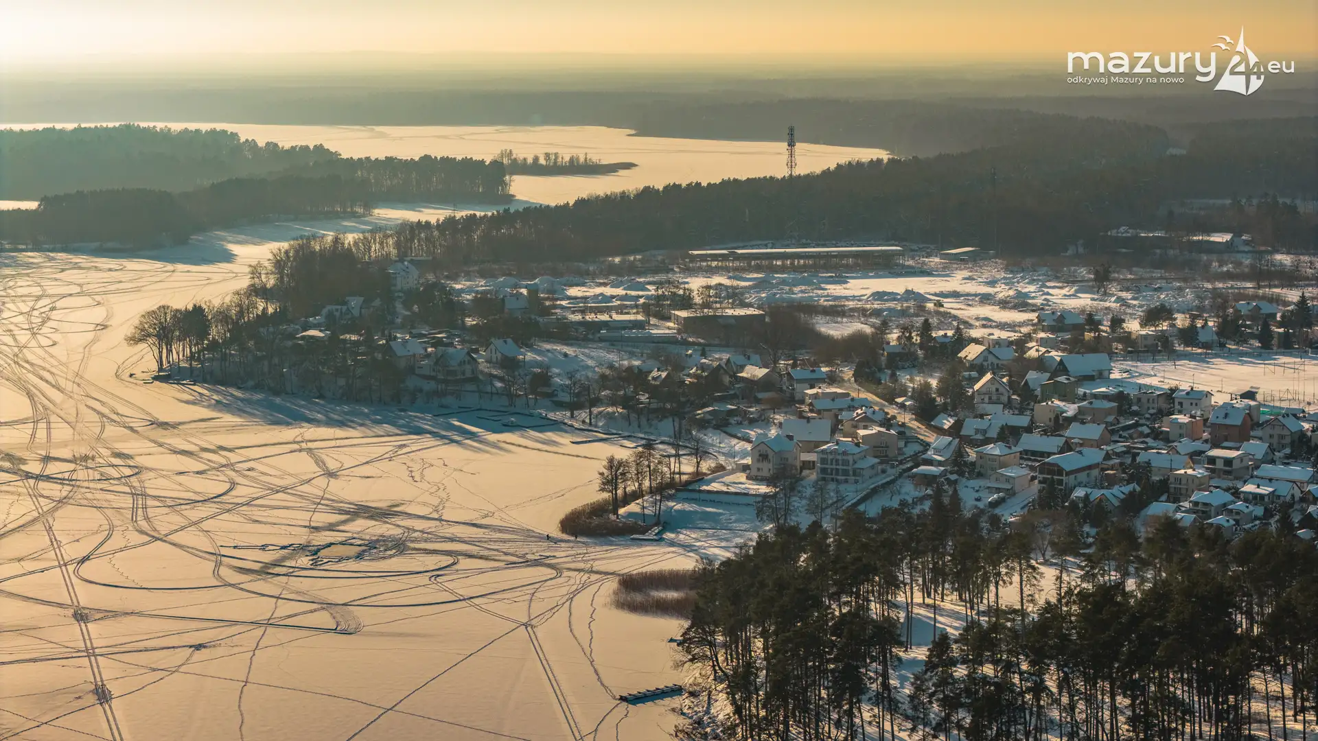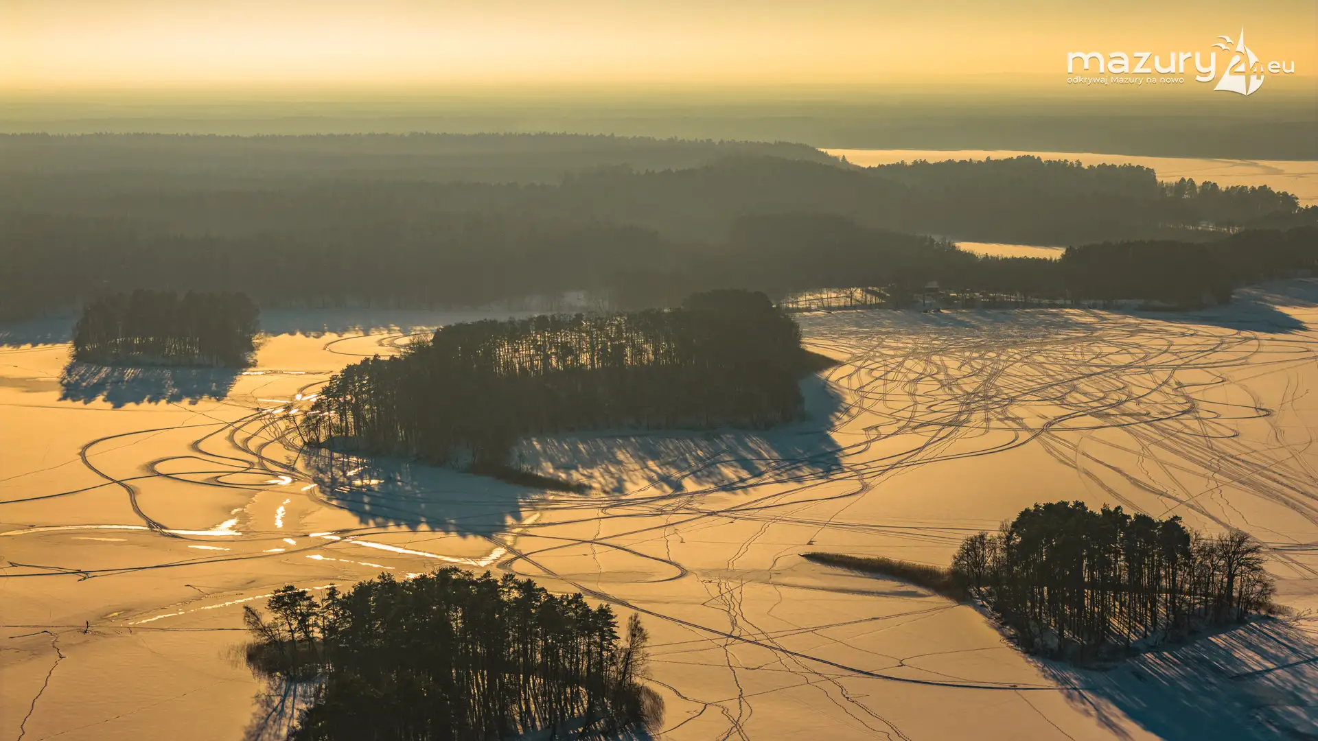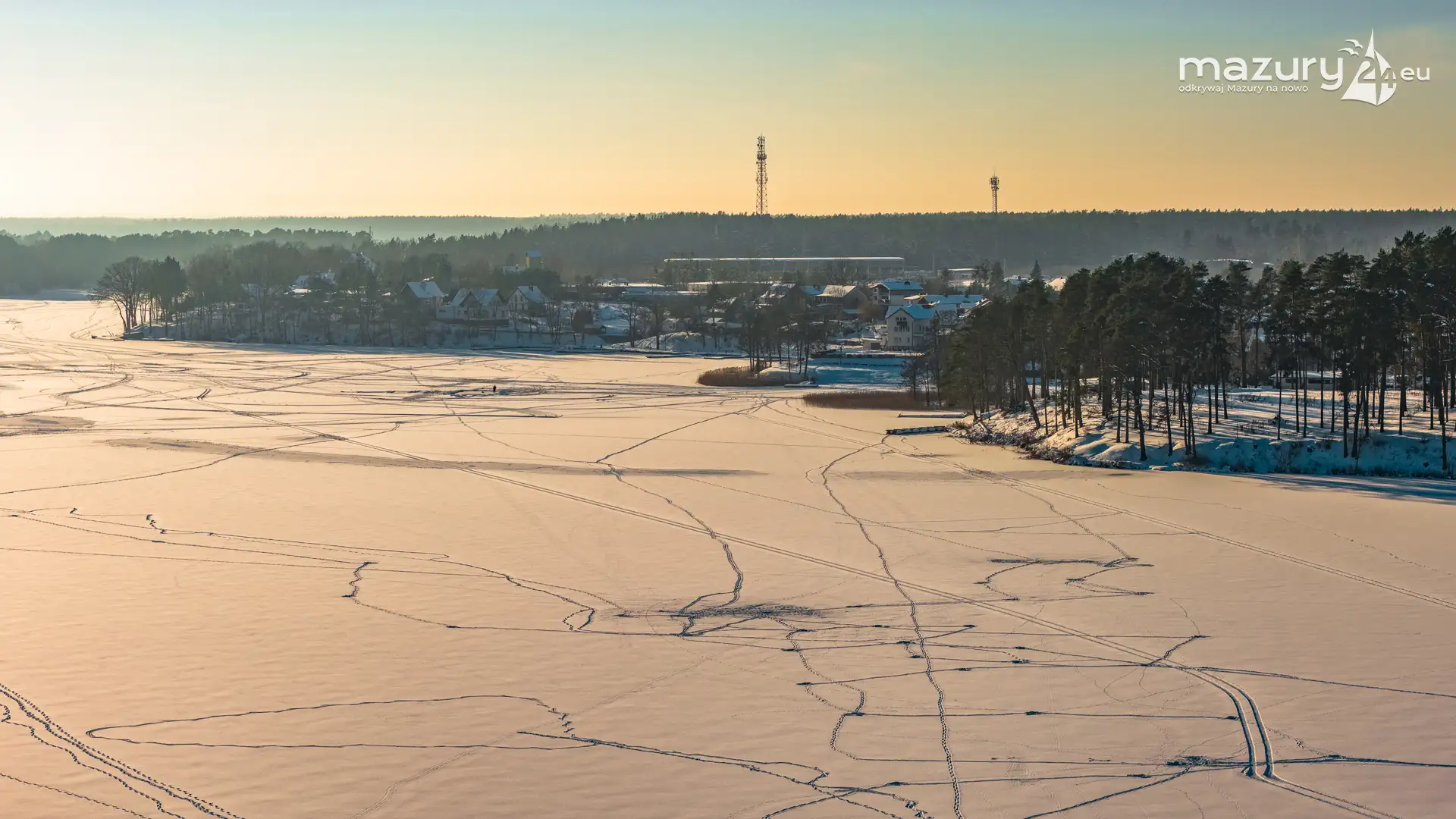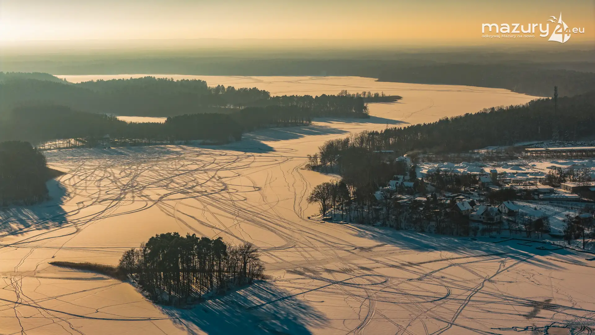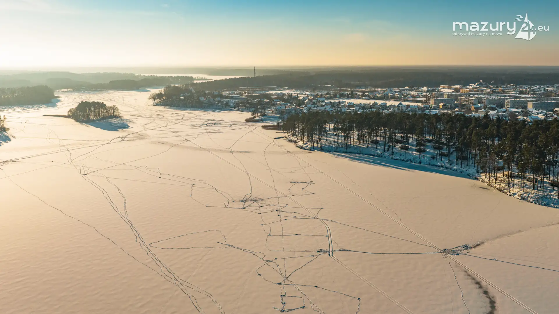 Zachód słońca nad jeziorem Śniardwy z drona, styczeń 2026 r.