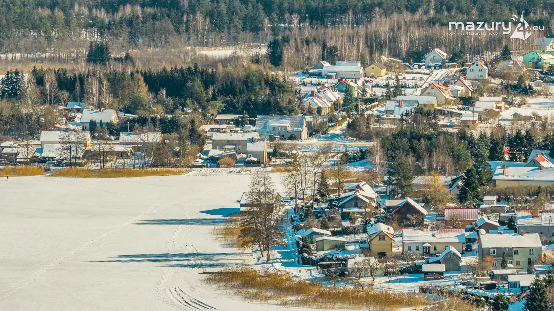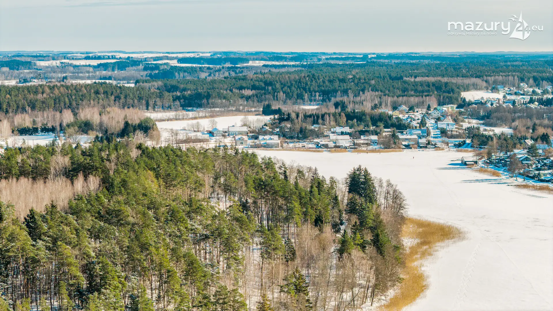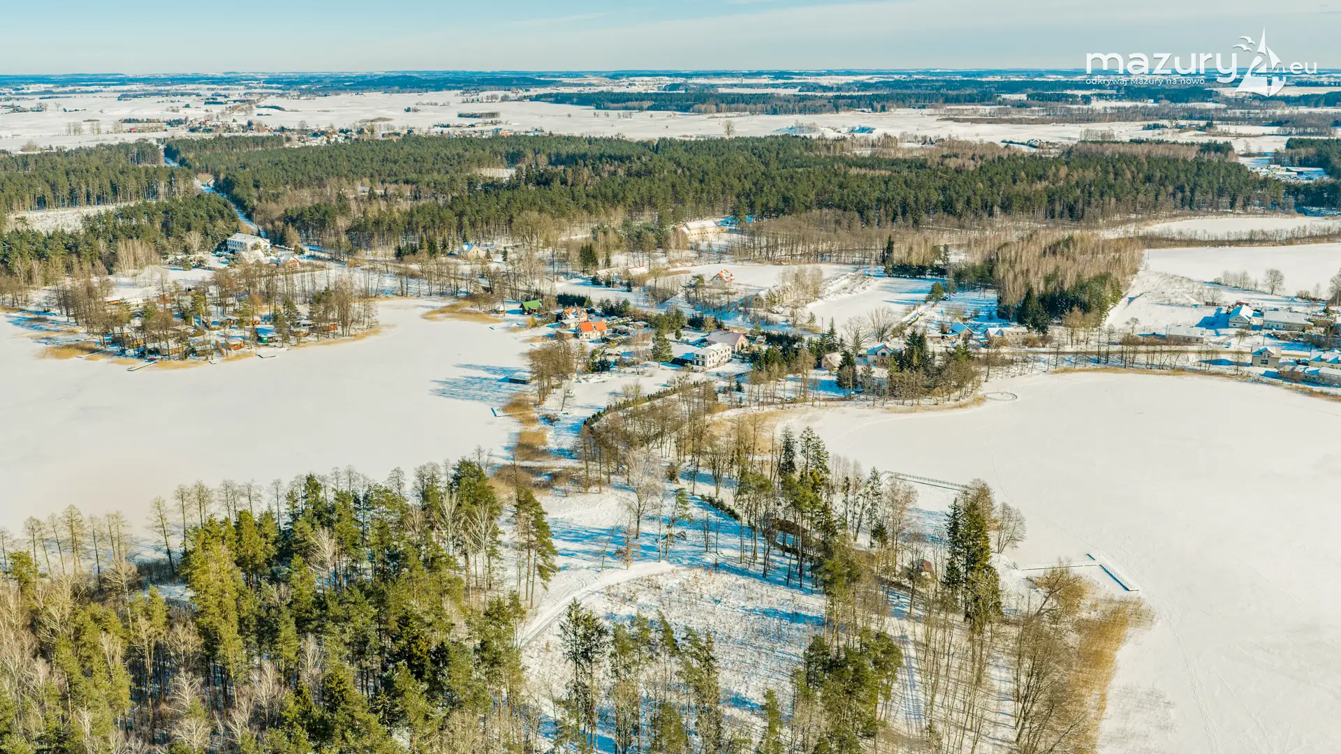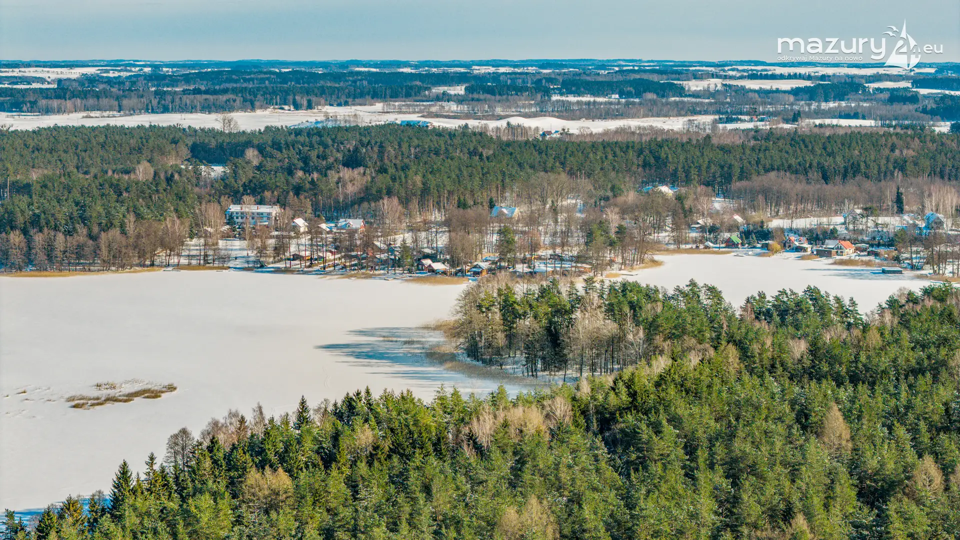 Wieś Sucholaski przy jeziorze Wydmińskim z zimowego lotu ptaka, luty 2026 r.