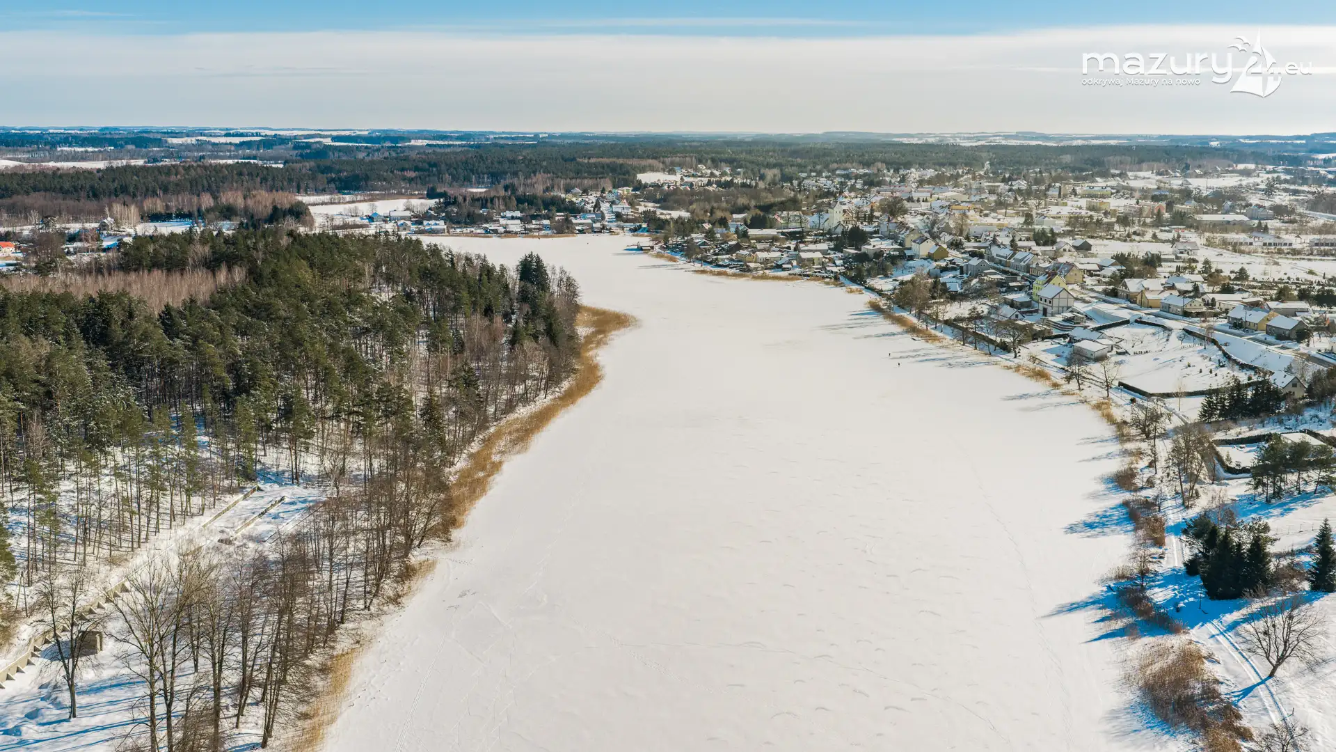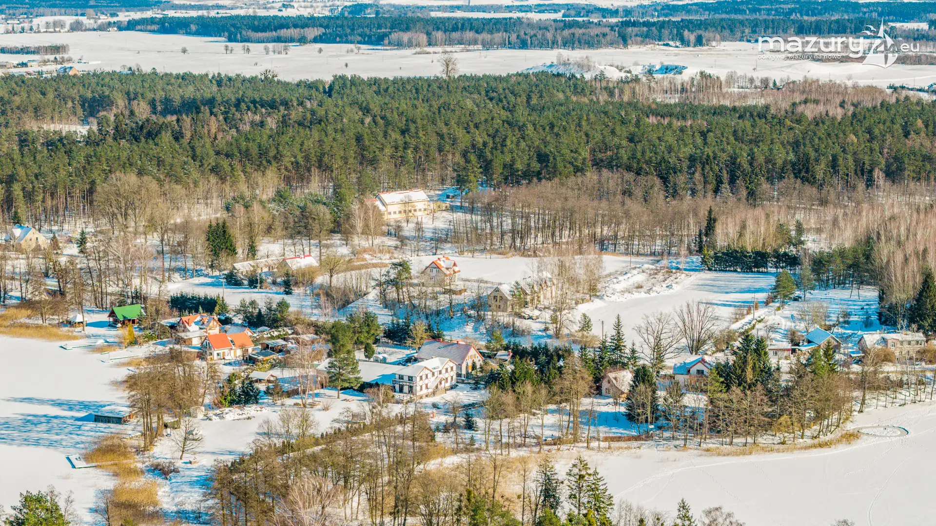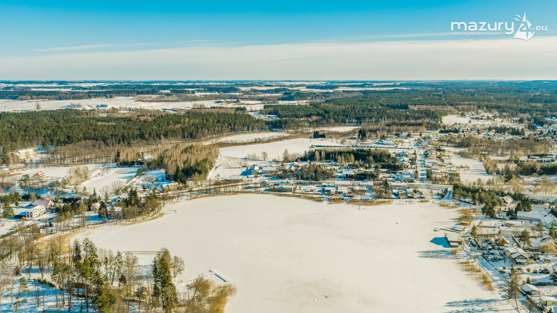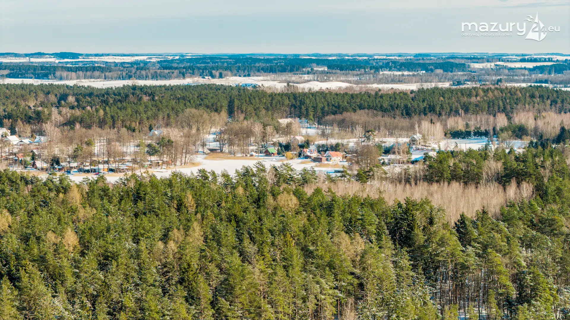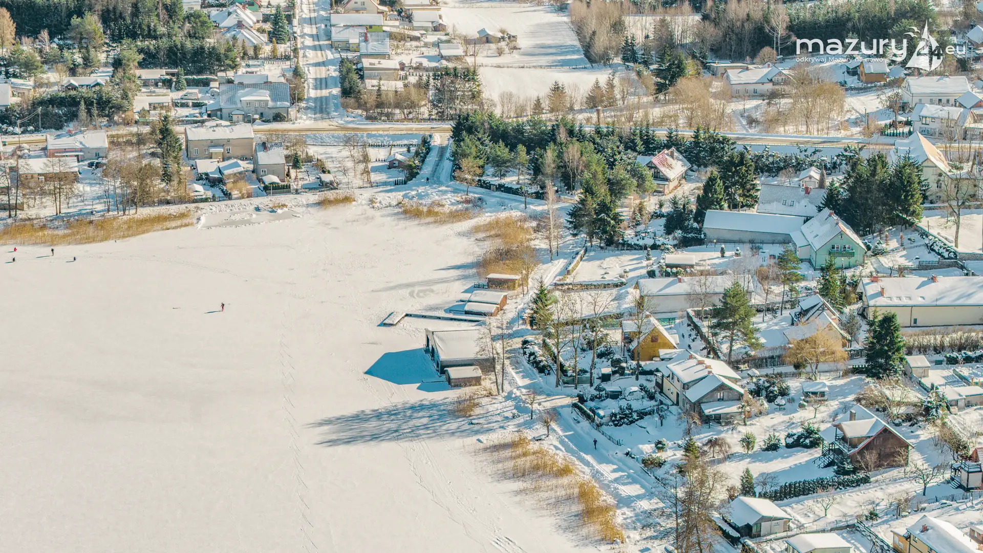 Wieś Sucholaski przy jeziorze Wydmińskim z zimowego lotu ptaka, luty 2026 r.