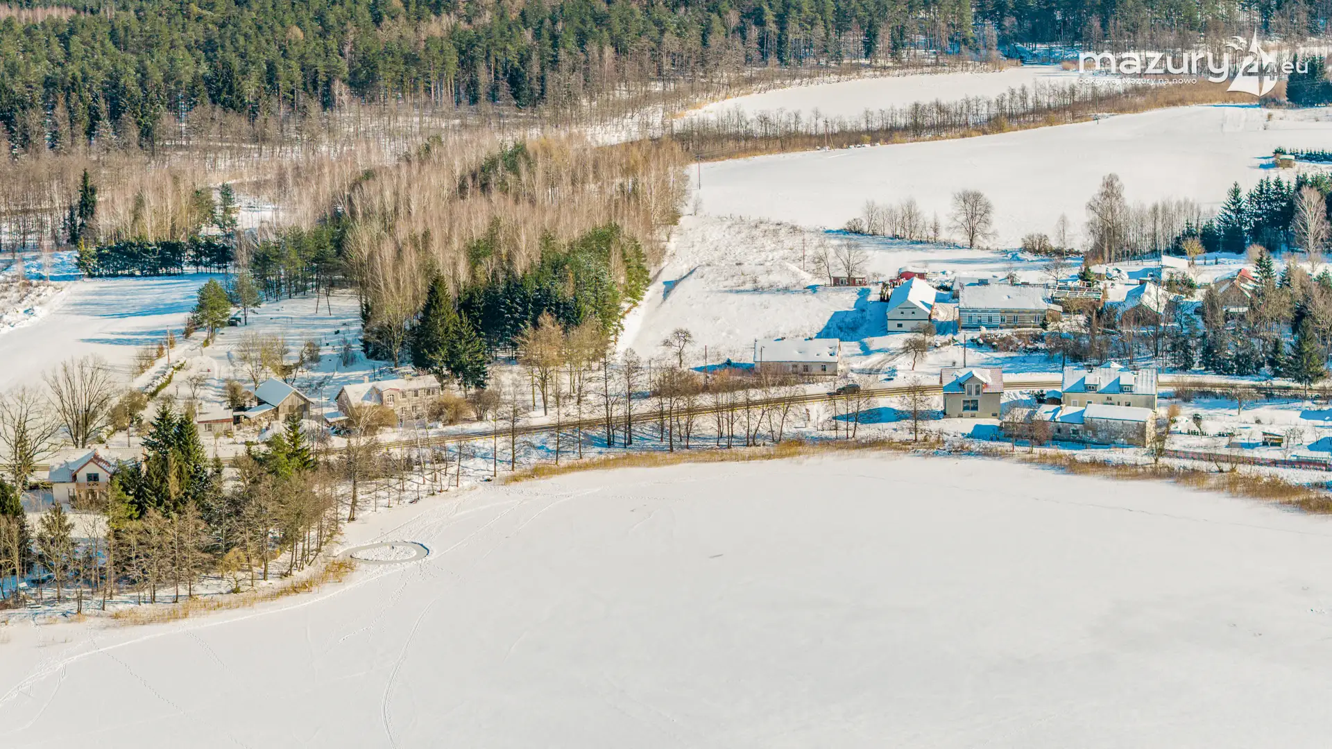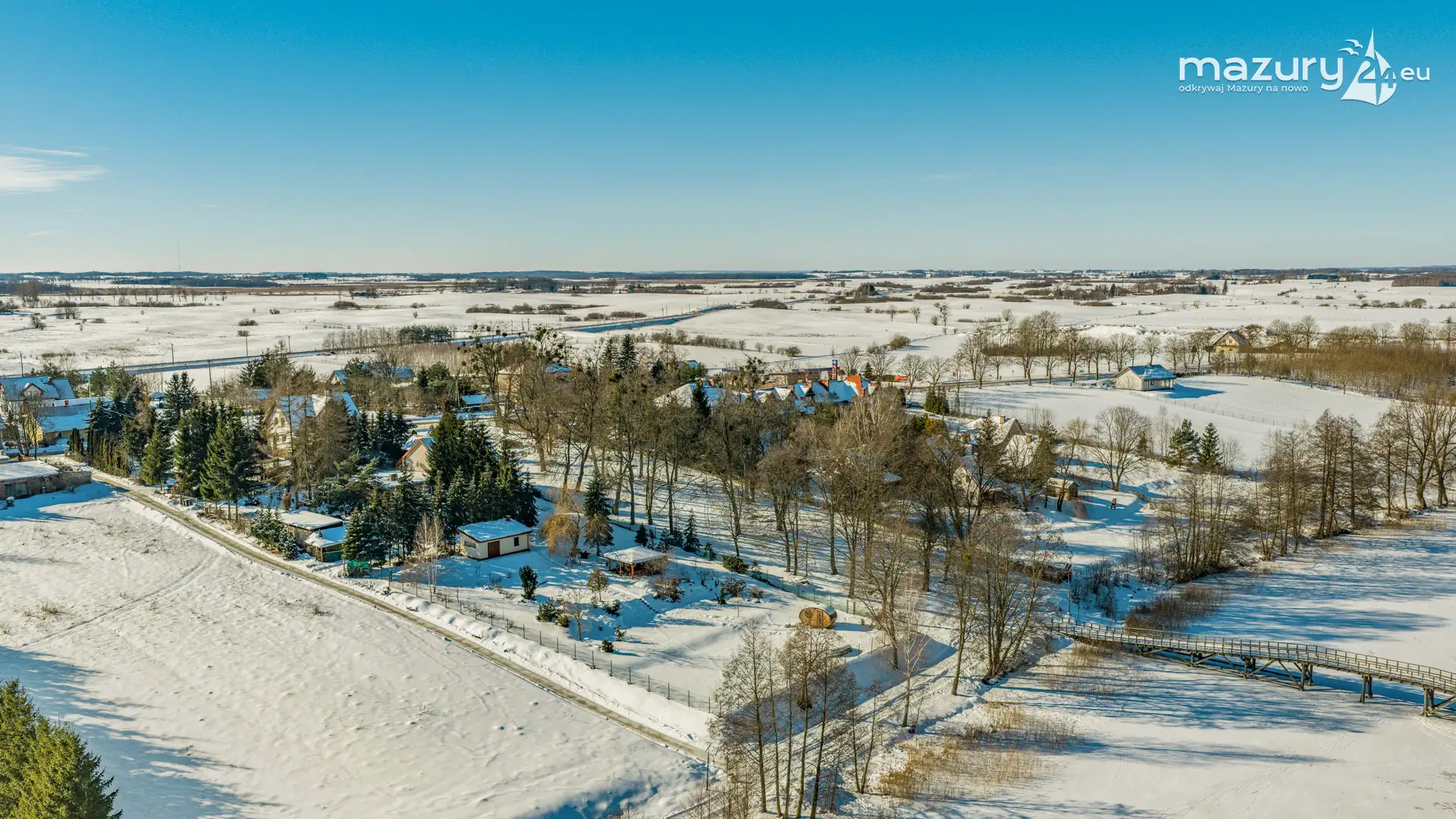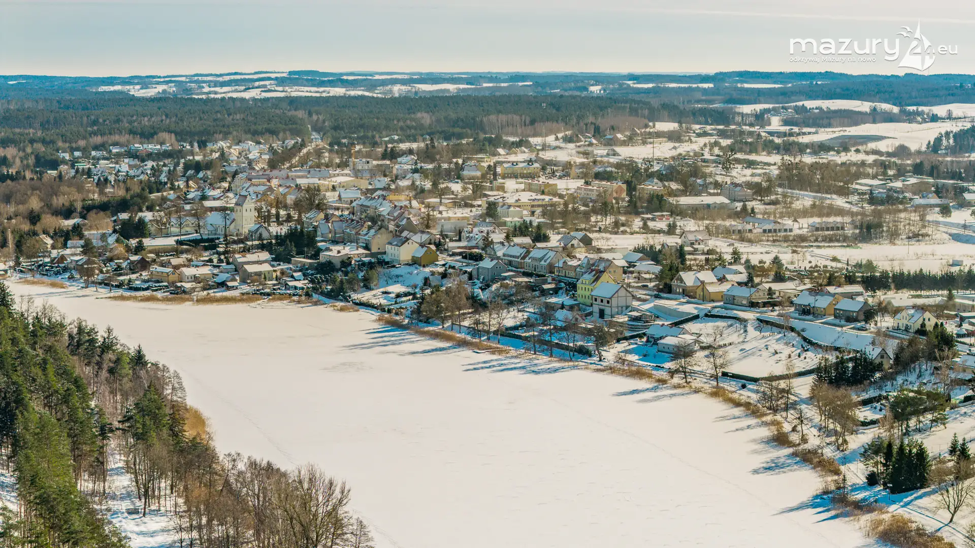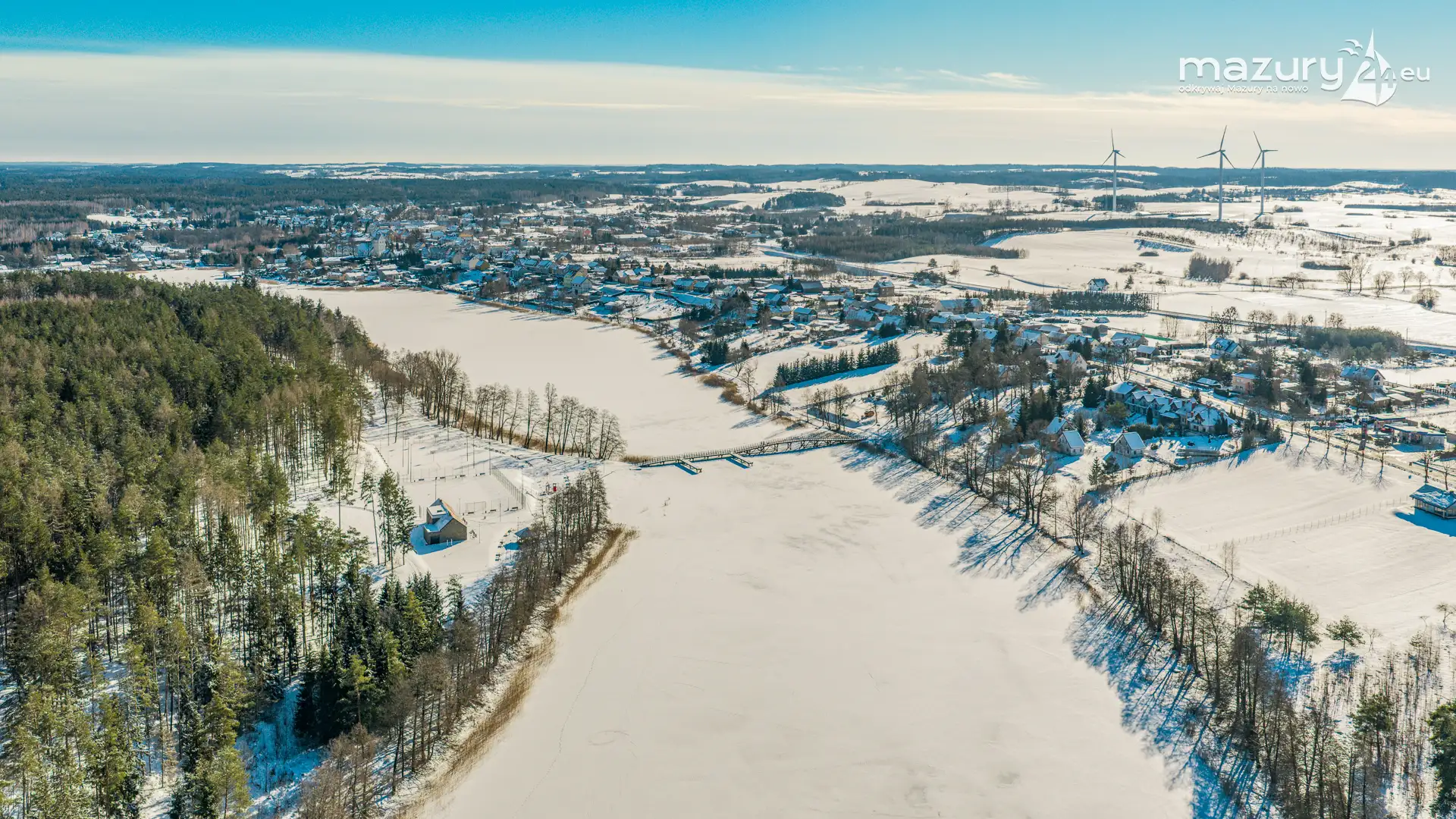 Wieś Sucholaski przy jeziorze Wydmińskim z zimowego lotu ptaka, luty 2026 r.