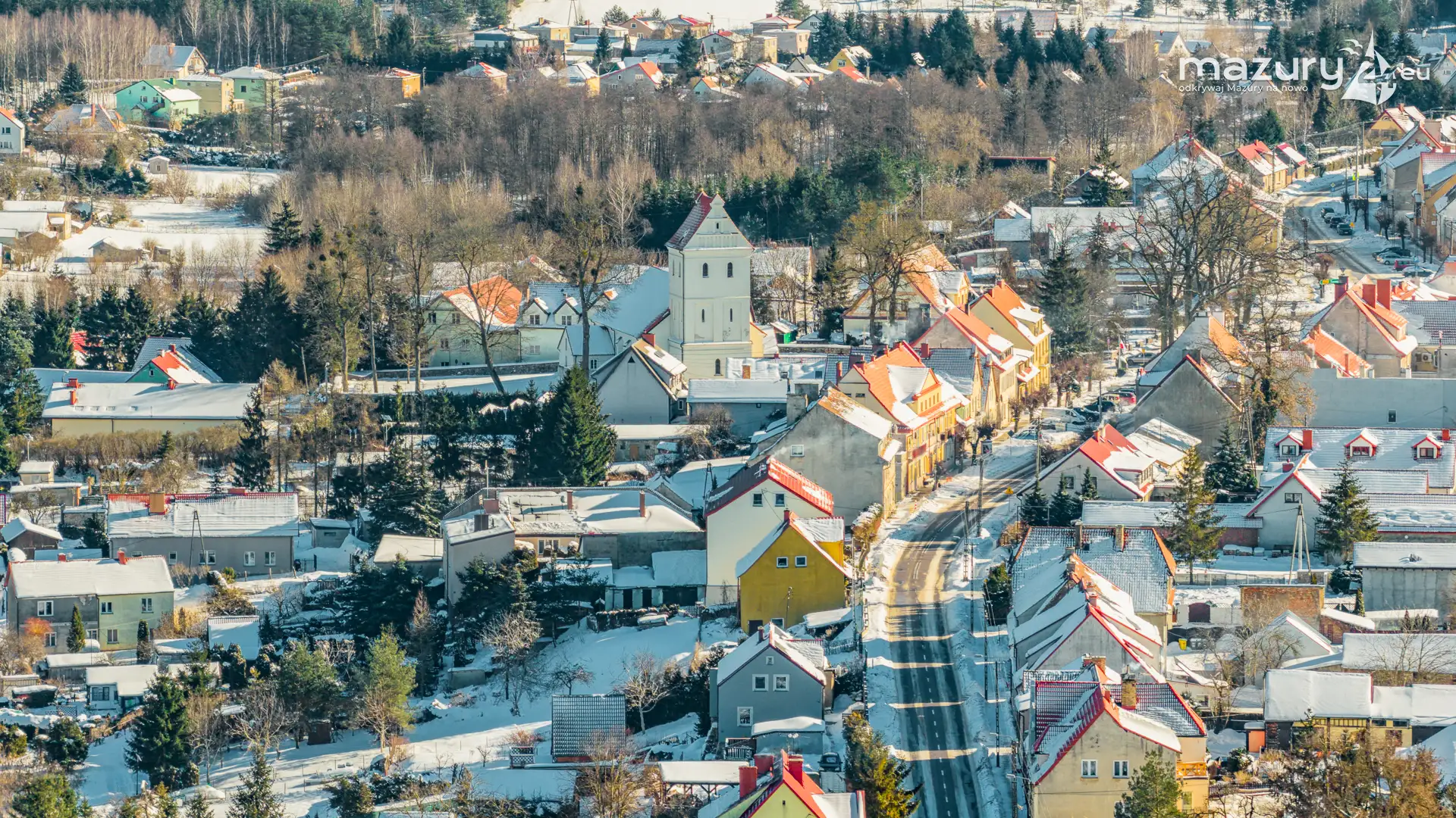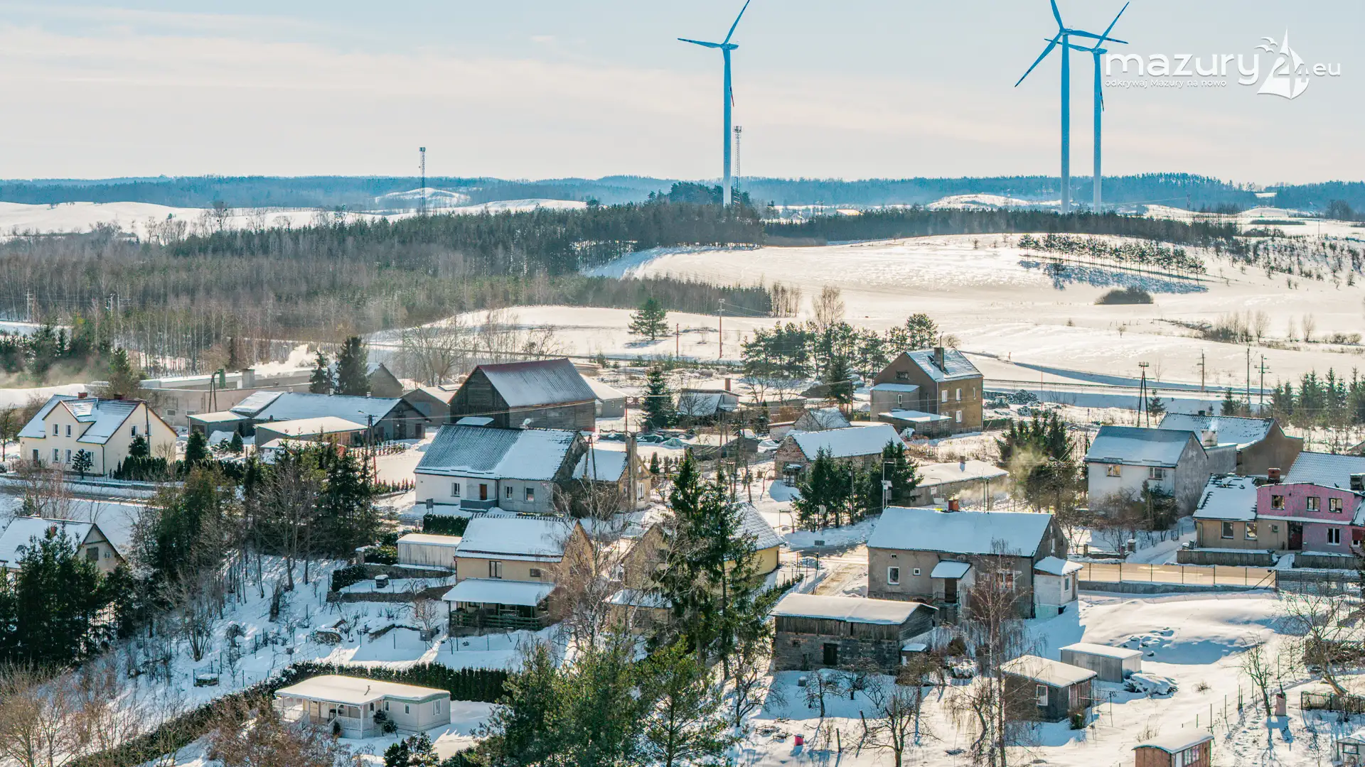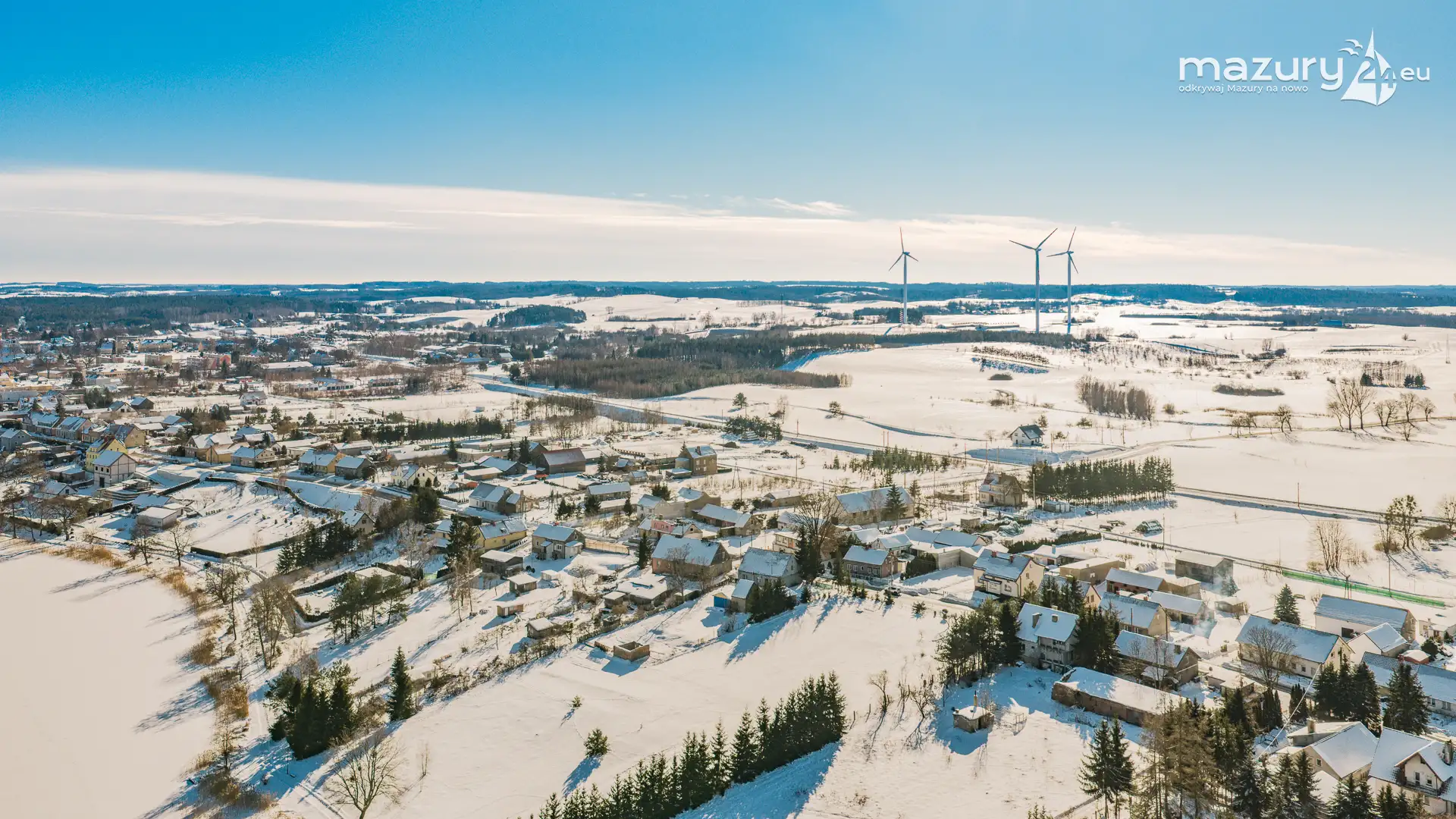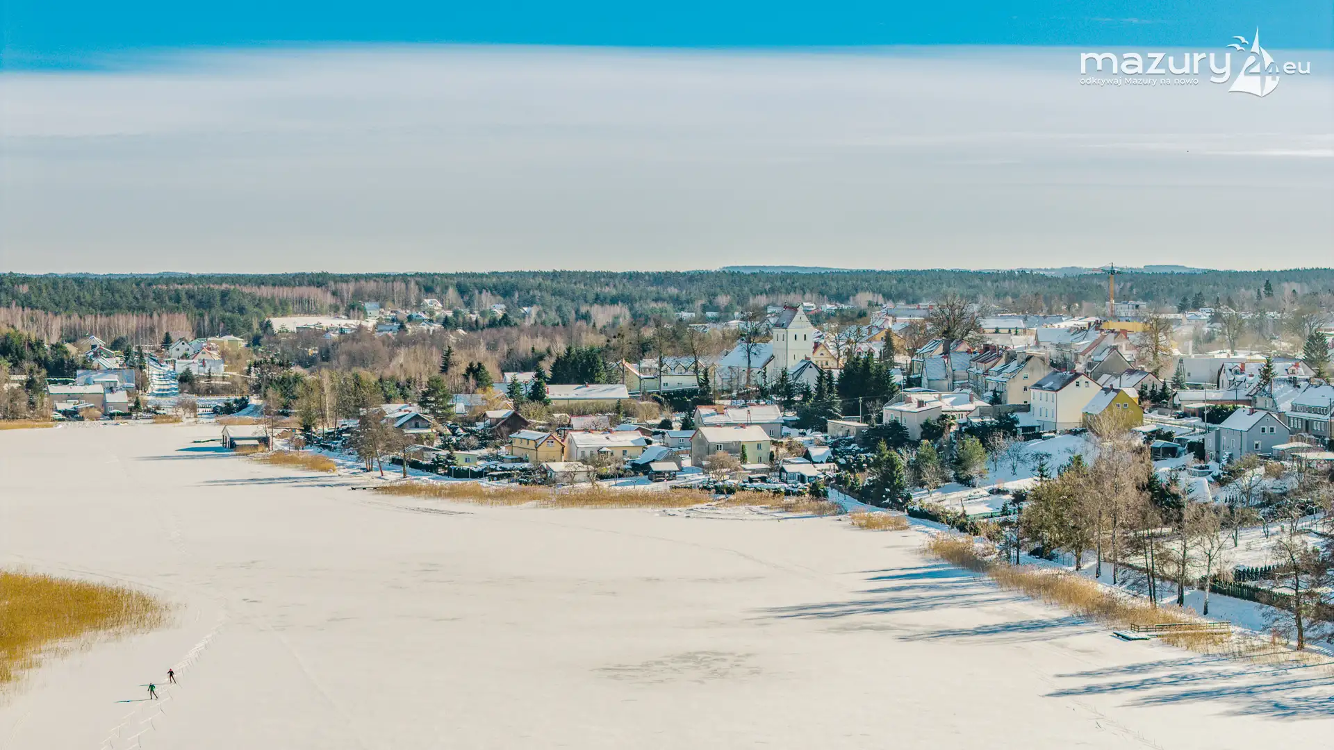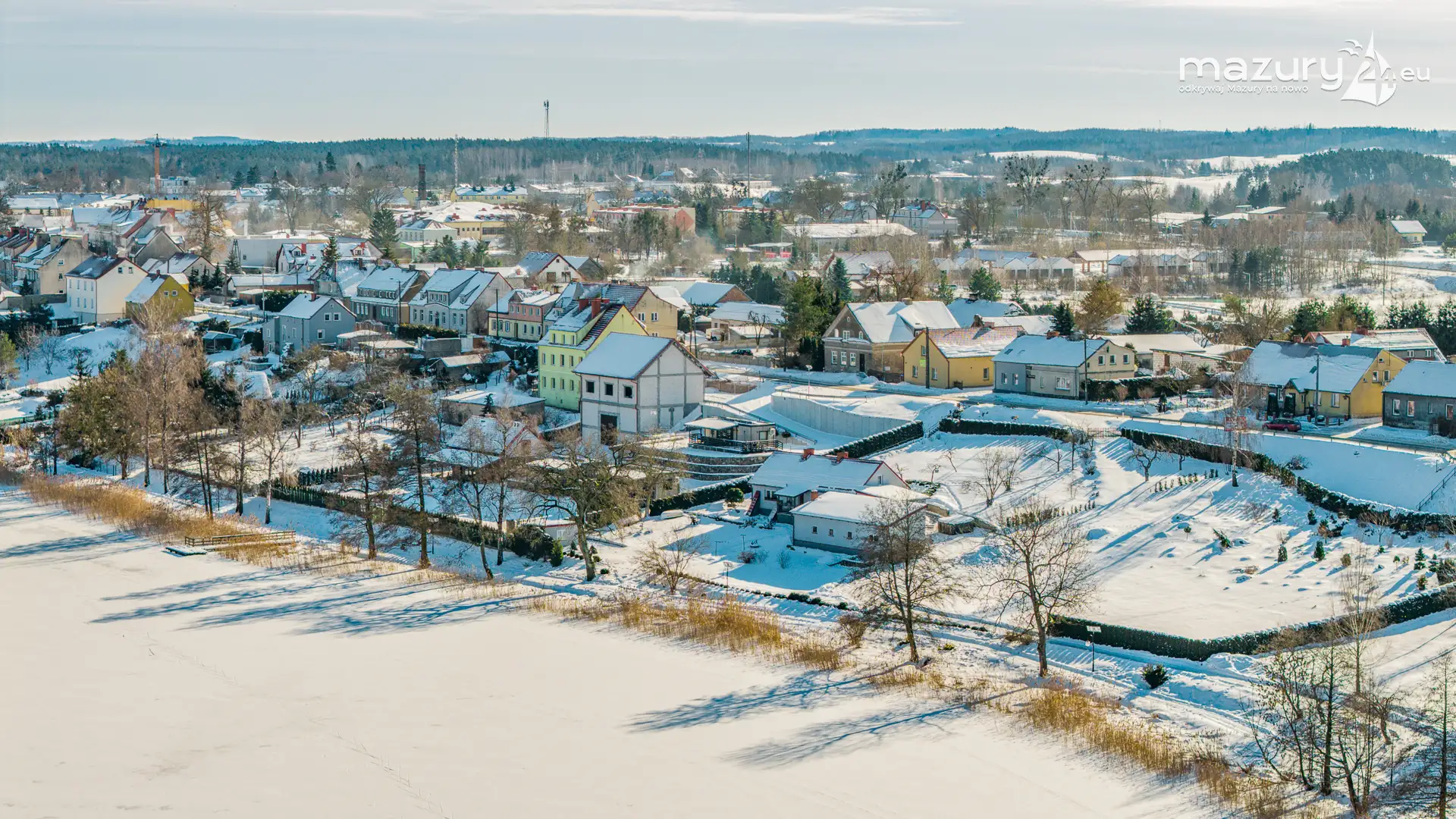 Wieś Sucholaski przy jeziorze Wydmińskim z zimowego lotu ptaka, luty 2026 r.