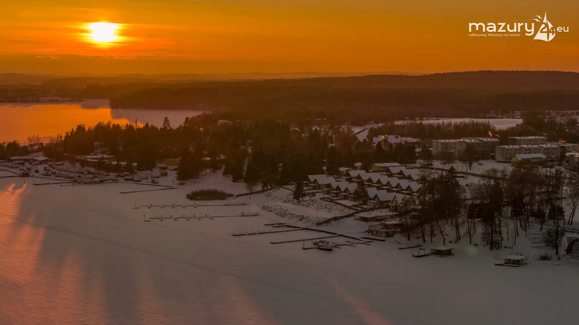 Zachód słońca nad jeziorem Ryńskim z drona, luty 2026 r.