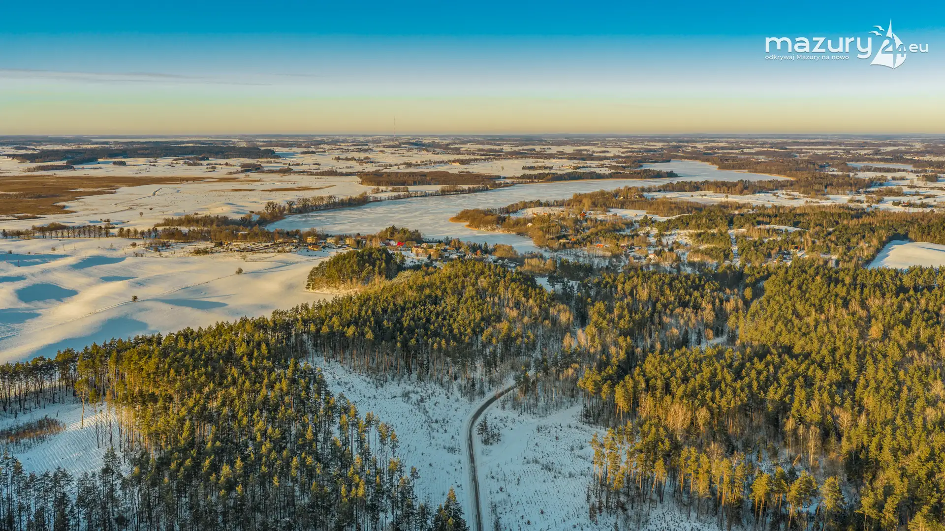 Wieś Sucholaski przy jeziorze Wydmińskim z zimowego lotu ptaka, luty 2026 r.