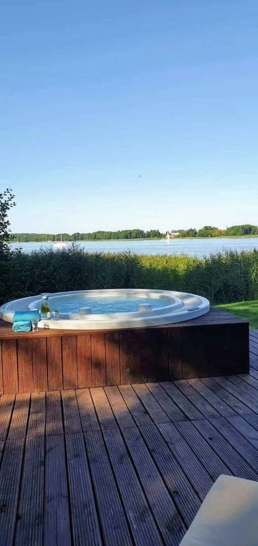 Perełka w naszej ofercie! Gwarantuje relaks i wypoczynek bez względu na pogodę dzięki wielkiemu tarasowi z jacuzzi, które może schłodzić w upalny dzień lub rozgrzać w chłodniejszy. A wszystko z przepięknym widokiem na jezioro Tałty i piękne, letnie zachody słońca. Bungalow składa się z dwóch dwuosobowych sypialni, salonu z w pełni wyposażonym aneksem kuchennym oraz łazienki z kabiną prysznicową. W salonie znajduje się rozkładana sofa. Bungalow przystosowany jest dla 6ciu osób. Ze wszystkich pokoi rozpościera się niepowtarzalny i niczym nie ograniczony widok na jezioro. Na tarasie znajduje się komplet mebli wypoczynkowych.