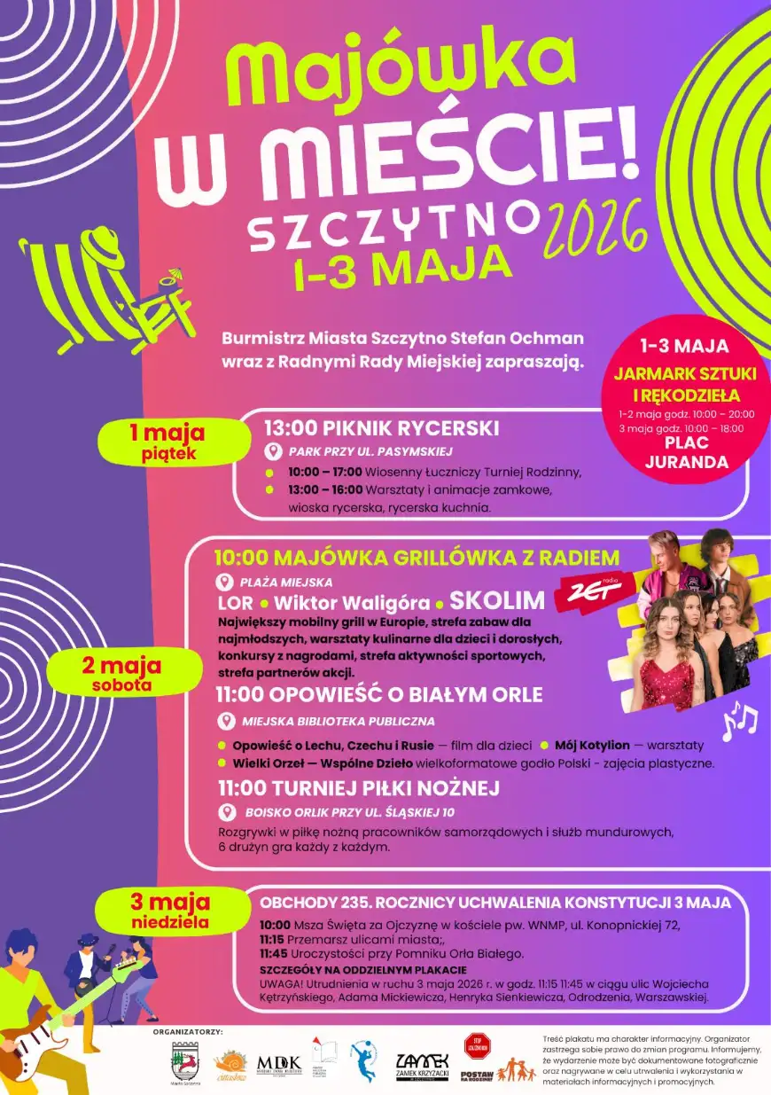 Burmistrz Miasta Szczytno, Stefan Ochman, wraz z Radnymi Rady Miejskiej zapraszają na huczne obchody majówki, które potrwają od 1 do 3 maja. Przez całe trzy dni na Placu Juranda odbywać się będzie Jarmark Sztuki i Rękodzieła (1-2 maja w godz. 10:00–20:00, 3 maja w godz. 10:00–18:00).
