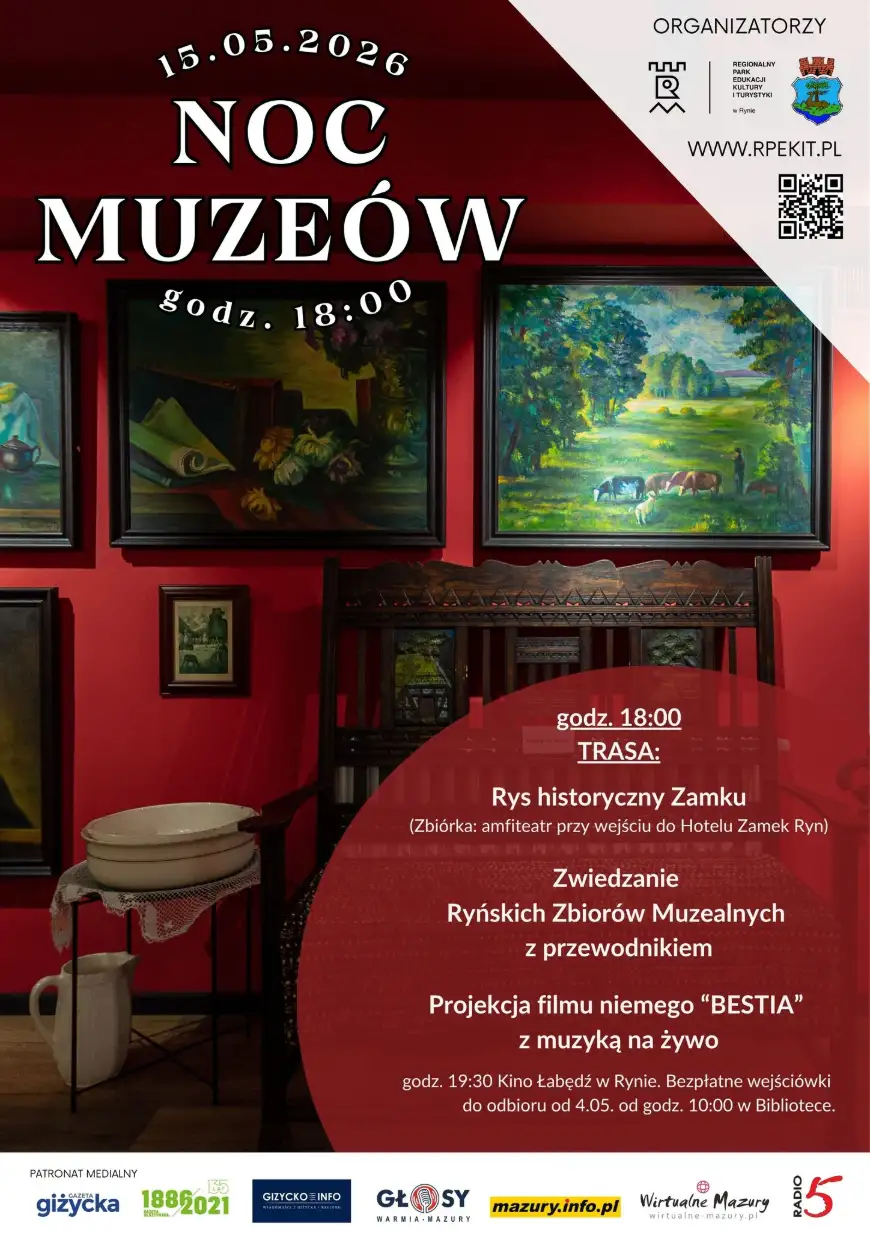 Ryn zaprasza na wyjątkową Noc Muzeów, która odbędzie się w piątek, 15 maja 2026 roku. Wydarzenie, poświęcone historii i magii kina niemego, rozpocznie się o godzinie 18:00 od spotkania z Mirosławem Kowalskim, który przybliży zebranym rys historyczny Ryńskiego Zamku. Kolejnym punktem programu będzie zwiedzanie Ryńskich Zbiorów Muzealnych pod opieką kustoszki Elzy Fitzy.