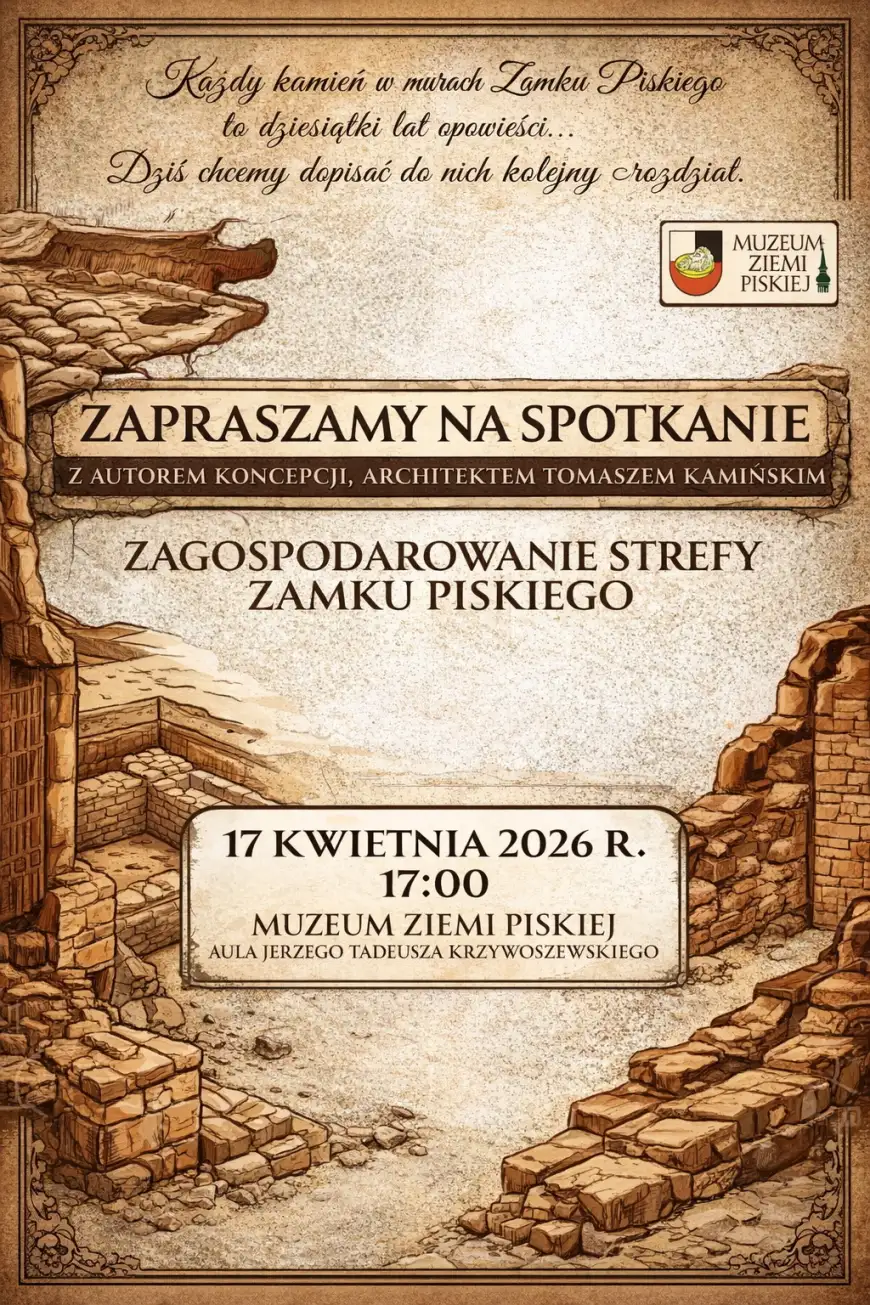 W piątek, 17 kwietnia 2026 roku, mieszkańcy będą mieli okazję poznać koncepcję zagospodarowania strefy zamkowej, przygotowaną przez architekta Tomasza Kamińskiego z Pracowni Architektonicznej Archander. Spotkanie odbędzie się o godzinie 17:00 w Muzeum Ziemi Piskiej, w Auli Jerzego Tadeusza Krzywoszewskiego.