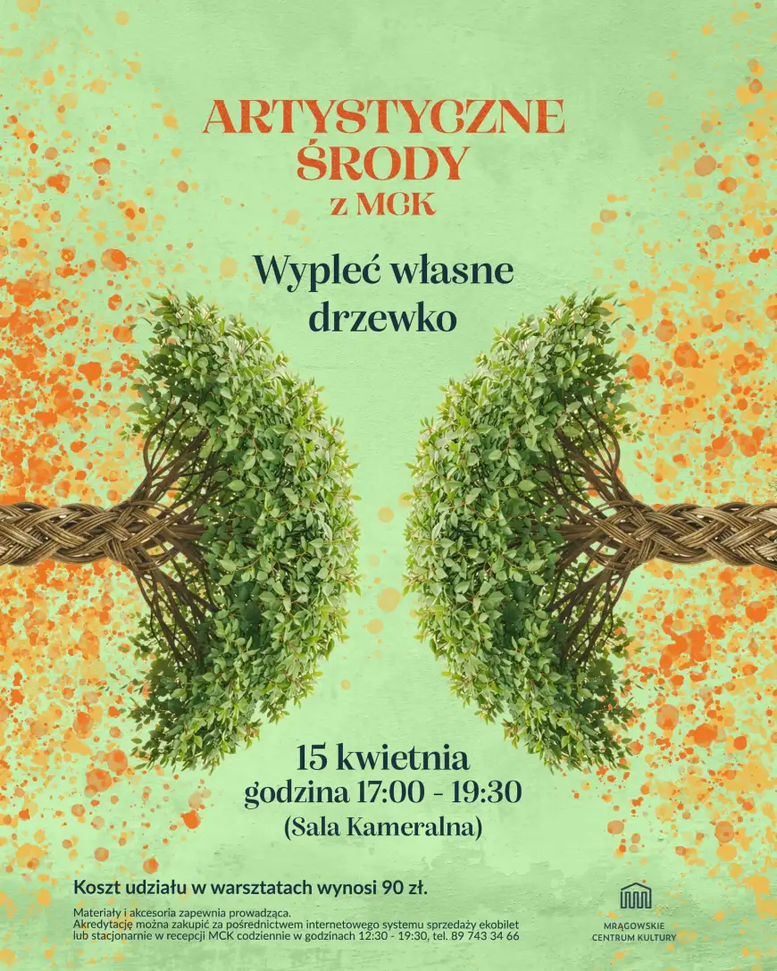 Zapraszamy na Artystyczną Środę w Mrągowskim Centrum Kultury, podczas której sięgniemy do korzeni – dosłownie. Uczestnicy stworzą własne plecione drzewa z naturalnej wikliny, łącząc tradycyjne techniki plecionkarskie z nowoczesnym designem.